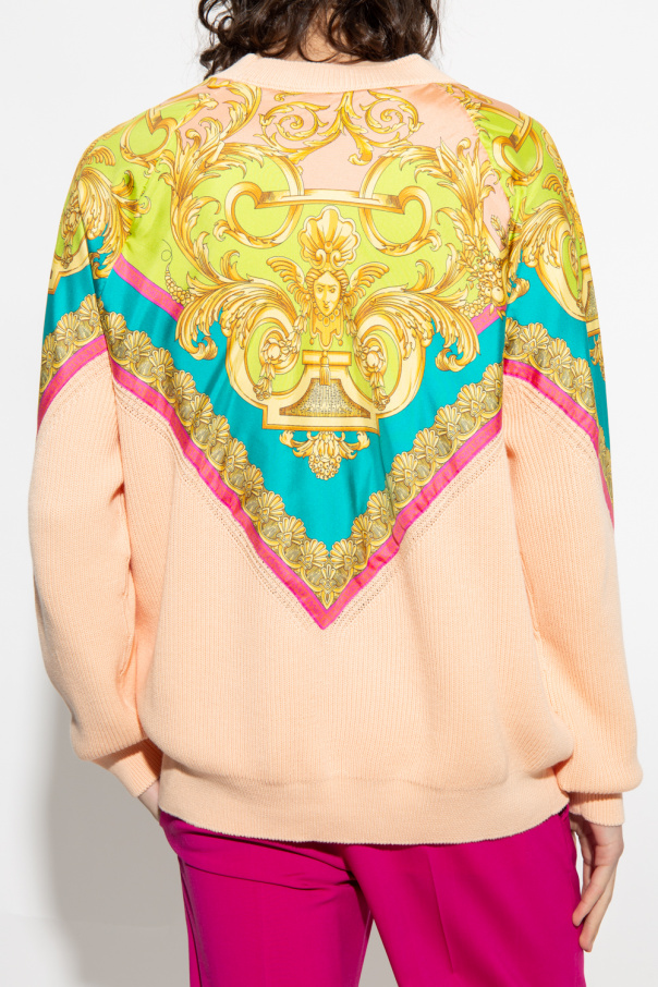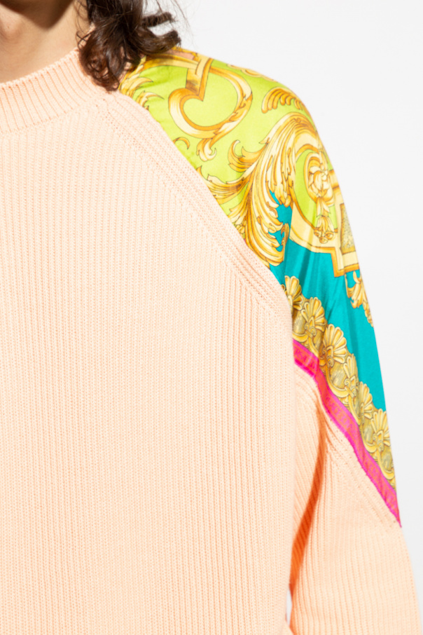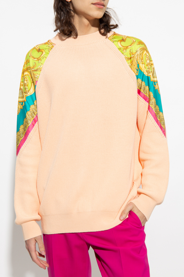 Light orange crewneck sweater from Versace. Crafted from cotton, this style showcases colourful silk patches with the brand's signature Barocco Goddess pattern and ribbed trims on the collar, bottom hem and cuffs.