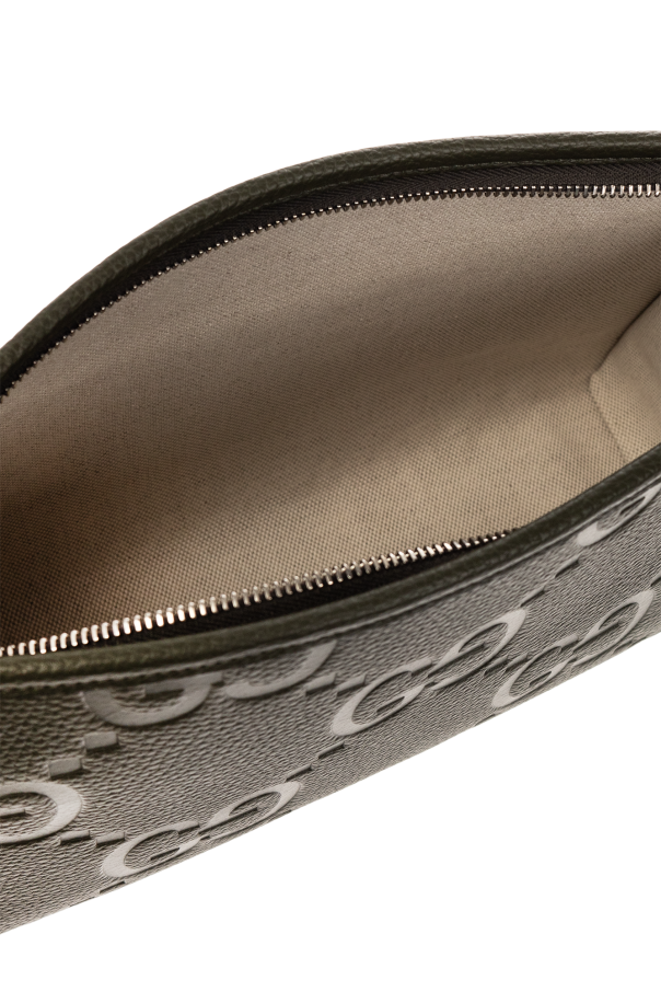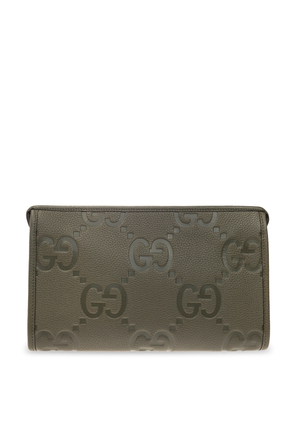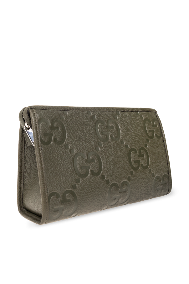 Dark green handbag from Gucci. Made of calf leather, this design secures with a zip and showcases an embossed monogram pattern. It is complete with silver-tone metal hardware and one internal compartment with a zip pocket.