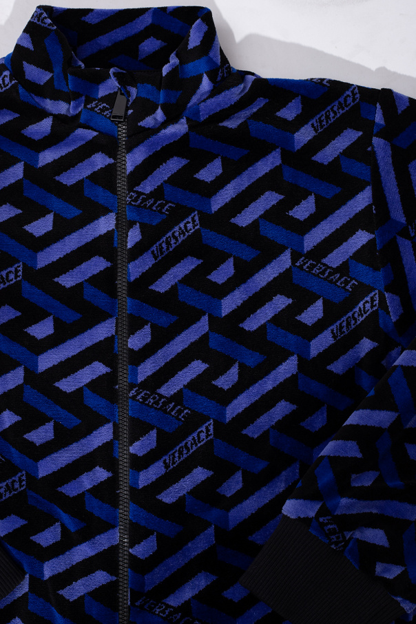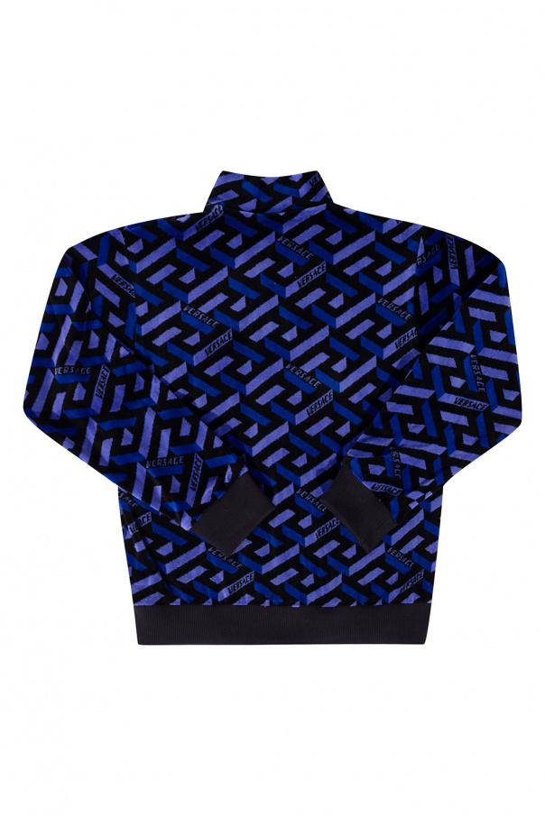 Navy blue, purple and black sweatshirt from Versace Kid. Enriched by a logo motif, this style features a zip fastening, two slip pockets and elasticized trims on the bottom hem and cuffs.