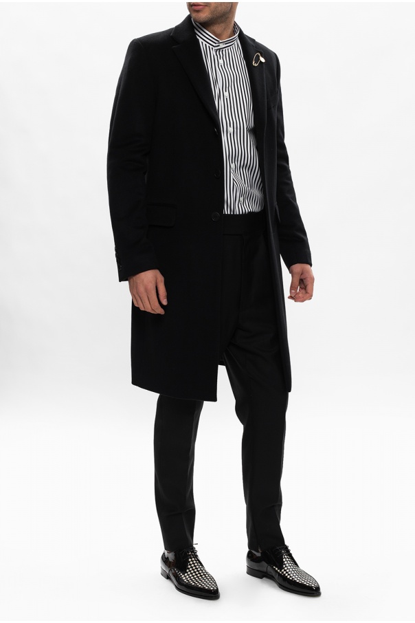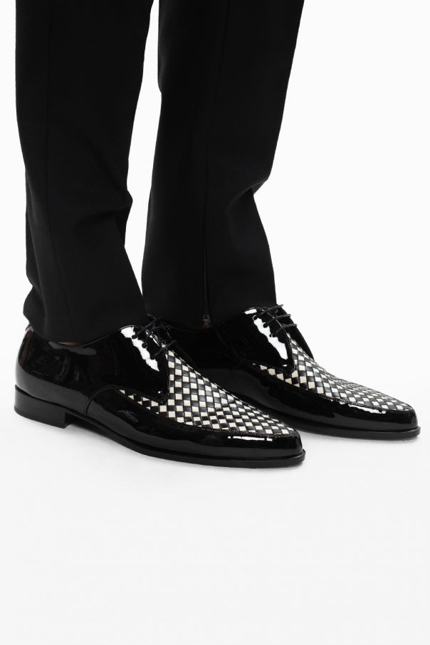 Black and white ‘Marceau’ Derby shoes from Saint Laurent. Crafted from patent leather, this lace-up pair sits on a black leather sole and showcases two-tone woven details.