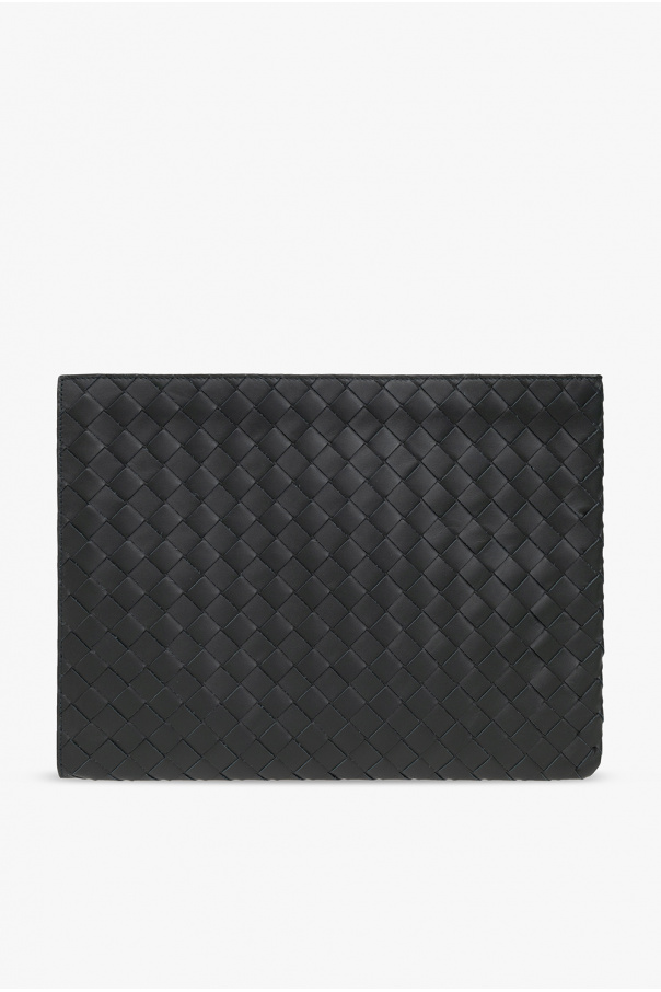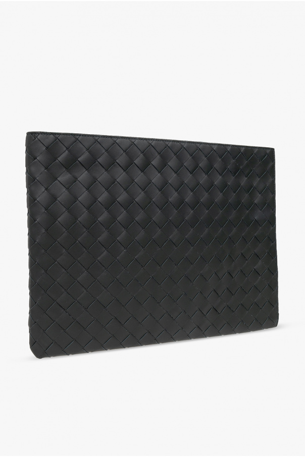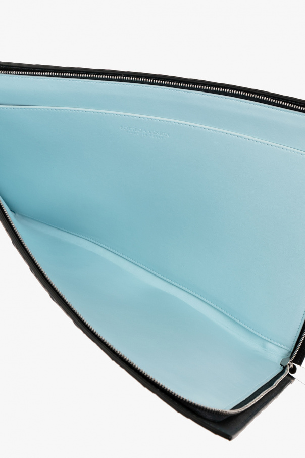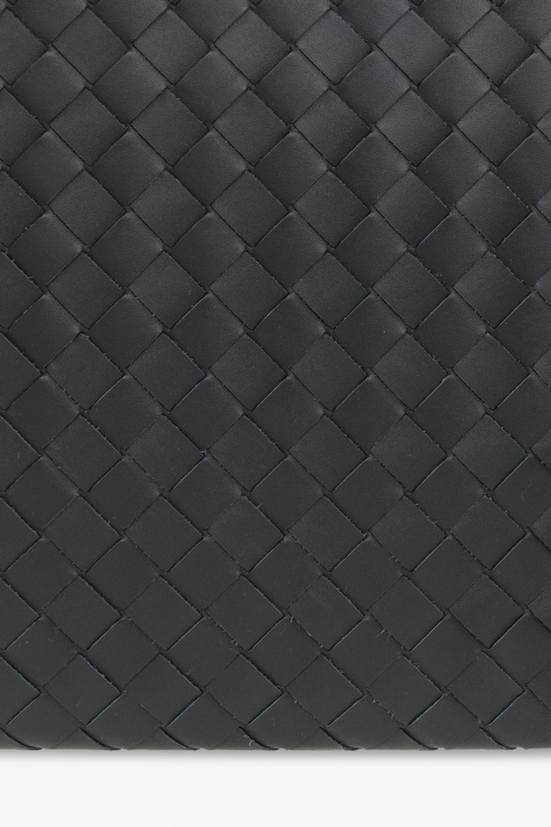 Dark green briefcase from Bottega Veneta. Crafted from calf leather with the brand's signature Intrecciato weave, this design secures with a zipper and features silver-tone metal hardware and one slip pocket inside.