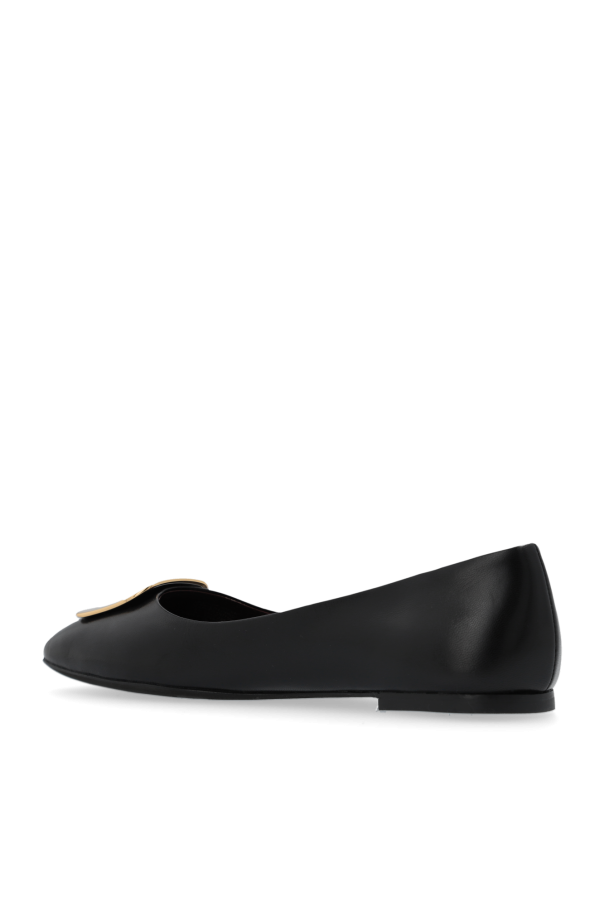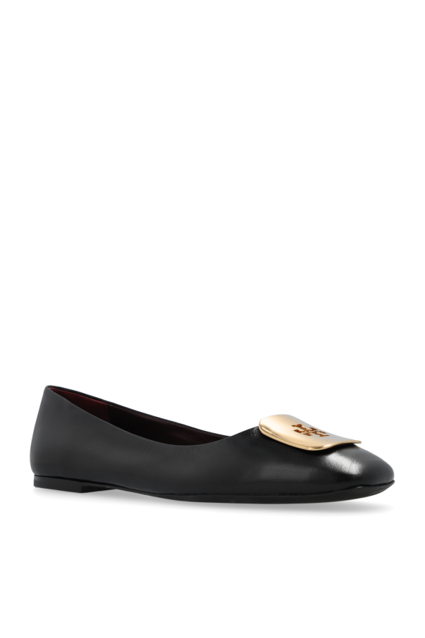 Black ‘Georgia’ ballet flats from Tory Burch. Made of leather, this pair features a metal logo detail in silver- and gold-tone as well as a rounded square toe and a rubber sole in black.