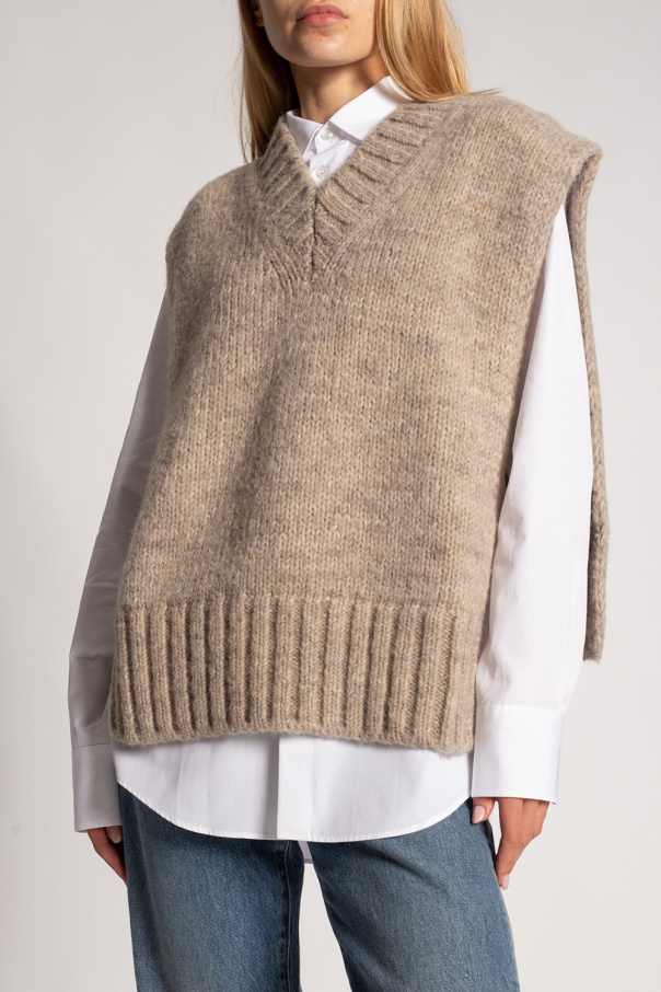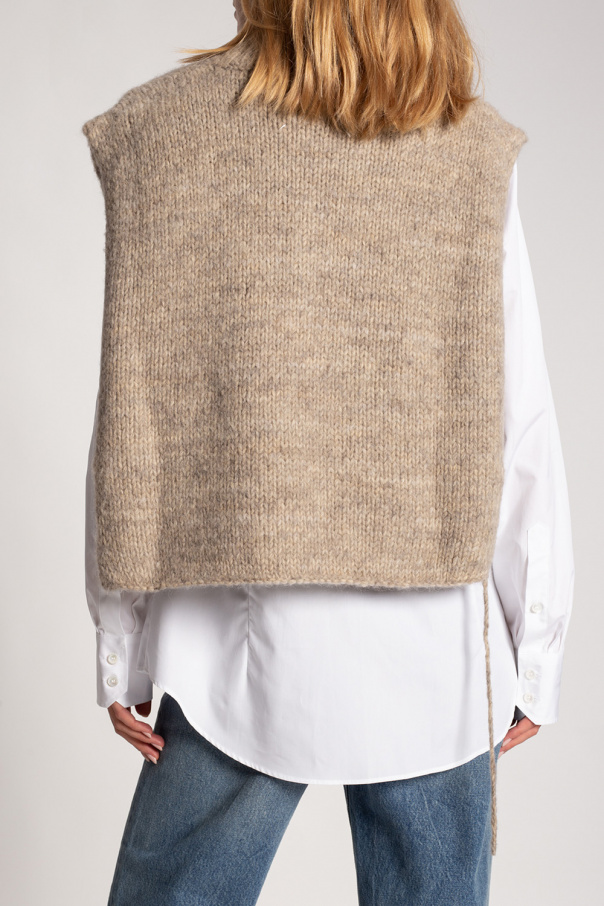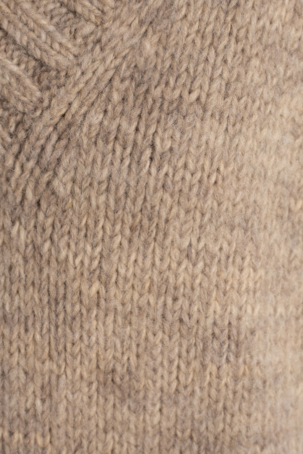 Beige poncho from Maison Margiela. Made of wool, this style features a V-shaped neckline, an embroidered white logo on the back and elasticized trims on the collar and bottom hem.
