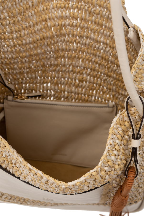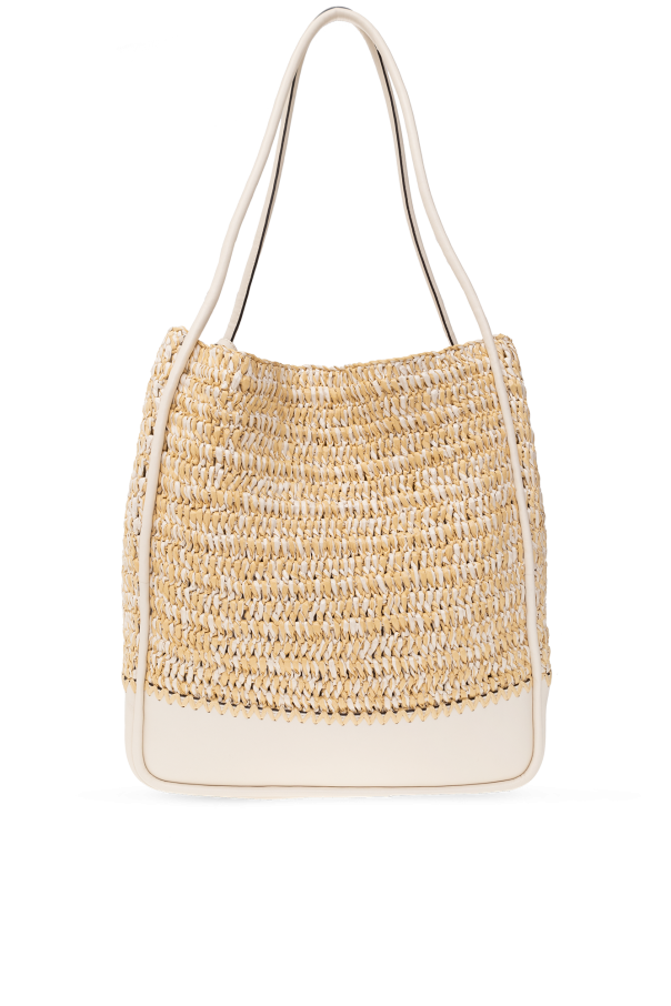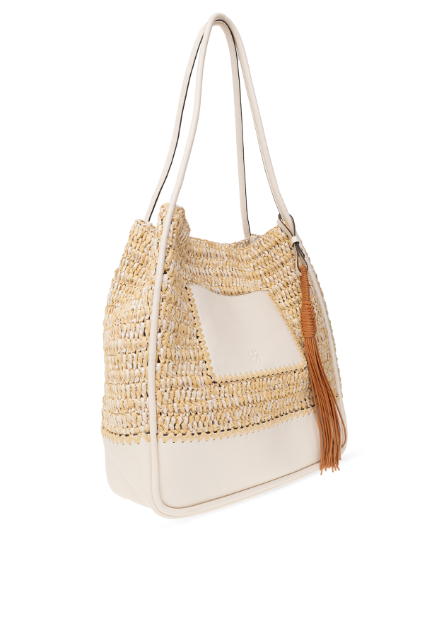 Beige and cream ‘Maya’ shopper bag from Ulla Johnson. Crafted from woven raffia and trimmed with leather, this design features a logo-embossed slip pocket on the front, two handles, gold-tone metal hardware, a detachable brown tassel charm and one internal compartment with a removable pouch on a strap.