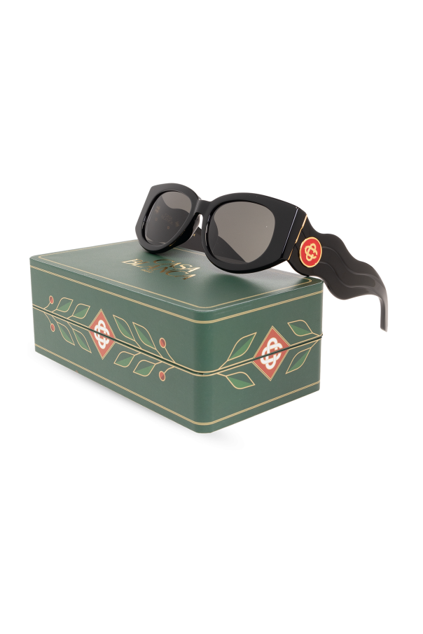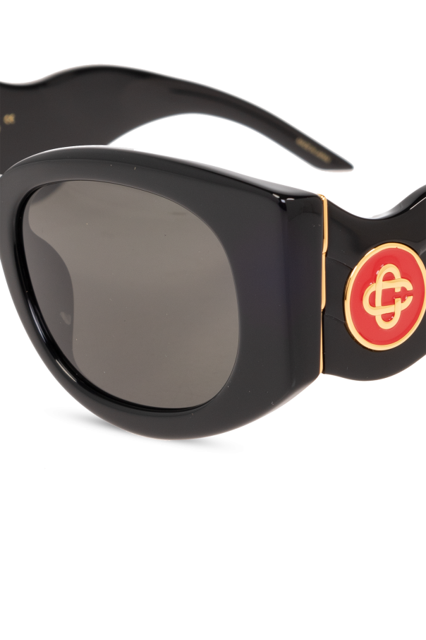 Black ‘The Memphis’ sunglasses from Casablanca. This pair features a rectangular frame, logo detail on the temples, gold-tone metal hardware and black lenses with 100% UV protection. Case included.