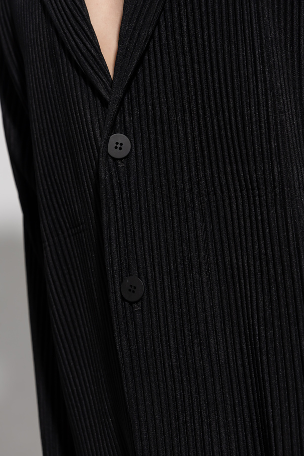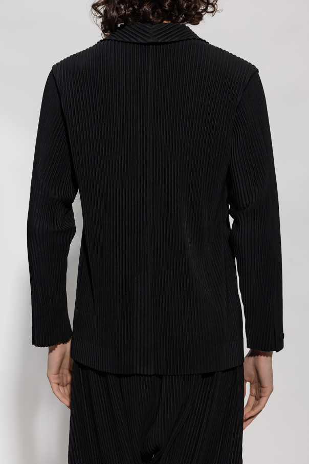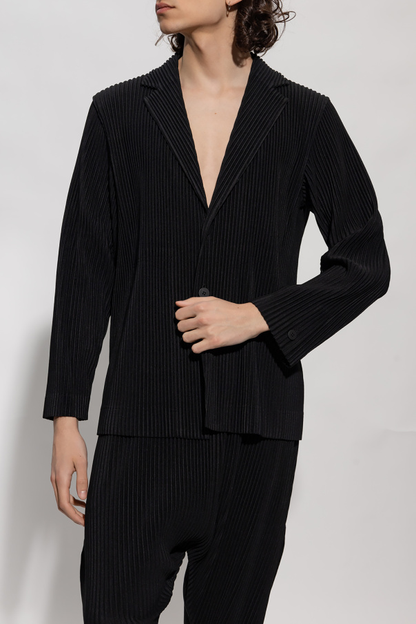 Black blazer from Issey Miyake Homme Plisse. Distinguished by the brand\'s signature pleats, this style features a collar with notch lapels, button fastenings and long sleeves with button cuffs.
