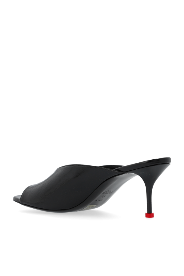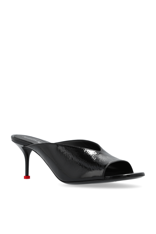 Introducing a paradigm of sophistication and refined taste, the Black Leather Heels by the illustrious Alexander McQueen blend timeless design with an audacious touch of modernity. Crafted with the utmost precision, these heels feature a sleek, classic silhouette adorned with a broad, high-gloss patent leather strap that gracefully secures the foot. The distinctiveness of these heels is further accentuated by their slender, medium-height stiletto heel in a striking red hue at the base, a signature trait that speaks volumes of the designer\'s innovative spirit and attention to detail. The interior of the shoe proudly displays the Alexander McQueen logo, underscoring the exclusive nature of this exquisite footwear. The rounded, open-toe design showcases the toes in an elegant manner, while the all-black leather composition, including both the insole and the sole, with a subtle addition of rubber for enhanced durability, ensures these heels are not only a statement of luxury but also of comfort and longevity. Why Purchase This Product? Elegant design with high-gloss patent leather for a sophisticated look. Iconic red-based stiletto heel as a distinctive designer hallmark. Exclusively branded with the Alexander McQueen logo, symbolizing luxury and exclusivity. Versatile and timeless, perfect for pairing with both formal and semi-formal attire. Superior craftsmanship with premium leather materials for lasting wear.