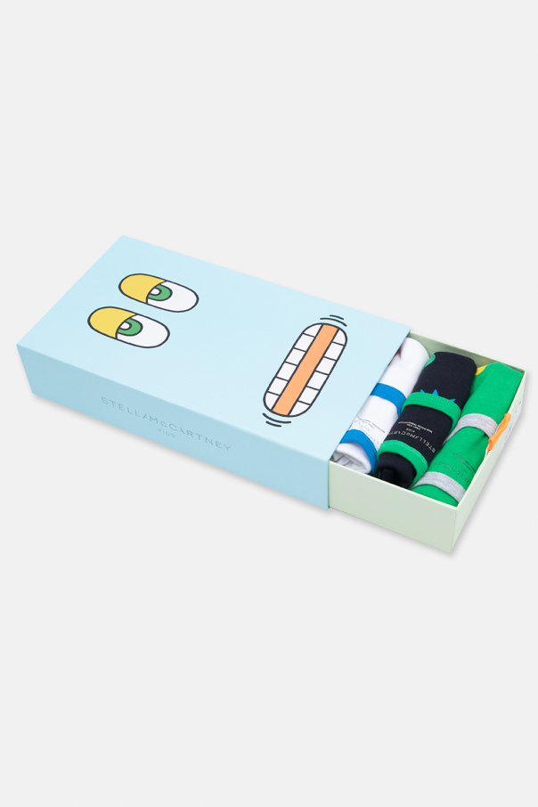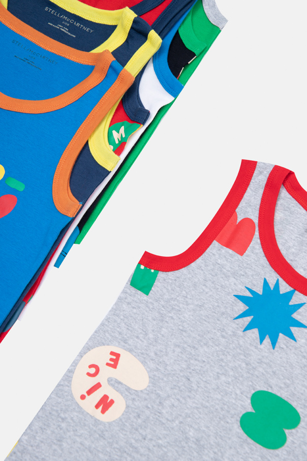 Multicoloured sleeveless crewneck T-shirt seven-pack from Stella McCartney Kids. Made of organic cotton from sustainable sources, each item showcases a logo graphic.