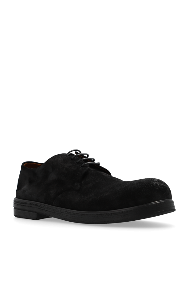 Introducing the ‘Zucca Zeppa’ Leather Shoes by Marsell, a testament to the venerable tradition of exquisite shoemaking. These shoes are the epitome of classic elegance, designed for the discerning gentleman who appreciates the fine balance between traditional aesthetics and modern sophistication. Crafted from premium suede leather, the ‘Zucca Zeppa’ boasts a texture and appearance that exude understated luxury. The black hue of the shoes, complemented by matching laces, creates a seamless and polished look, perfect for a variety of occasions. The interior reveals a contrasting finish in a warm beige or brown shade, adding an unexpected twist to its design. The robust leather and rubber sole ensures stability and longevity, while the decorative stitching adds a touch of elegance. With a rounded toe shape, these shoes offer a comfortable fit without compromising on style. Notably, the absence of an external designer logo speaks to Marsell’s commitment to subtlety and quality over overt branding. Adorned with a unique distressed effect, these shoes are not only a pair of footwear but a piece of artistry, demonstrating the meticulous craftsmanship Marsell is renowned for. Why Purchase This Product? Exquisite suede leather construction for luxury and durability. Elegant black color with a contrasting interior finish for a distinctive look. Stable and comfortable leather and rubber sole with anti-slip inserts. Subtle design with no external branding, focusing on quality and craftsmanship. Unique distressed effect, adding character and style.