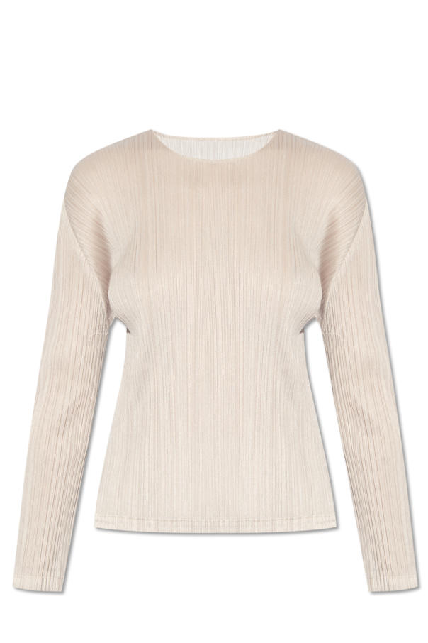 Cream pleated top with a round neck and long sleeves from Issey Miyake Pleats Please.