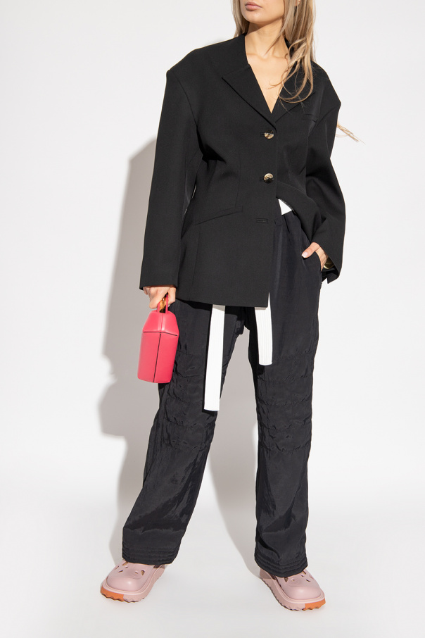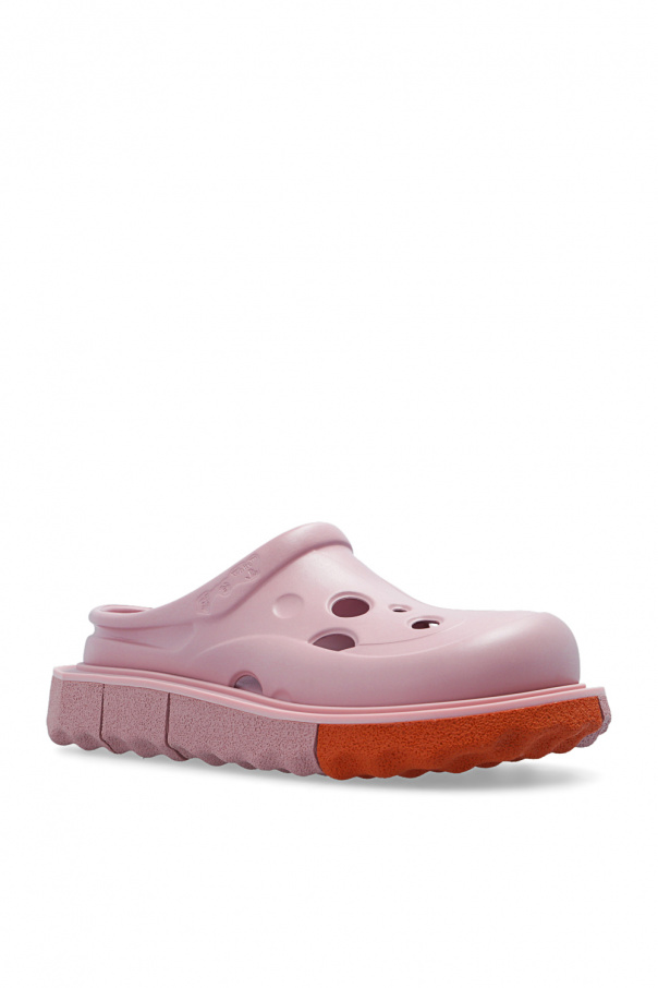Pink ‘Meteor’ slides from Off-White. Resting on a pink and orange rubber sole, this pair features decorative cut-outs, embossed logo and leather-trimmed lining.