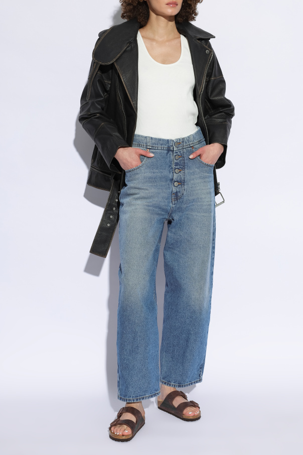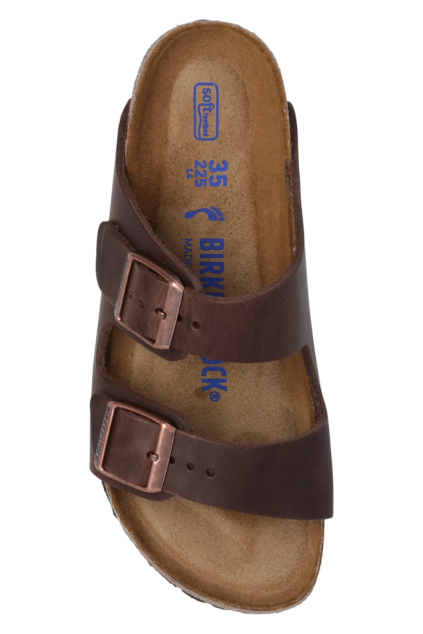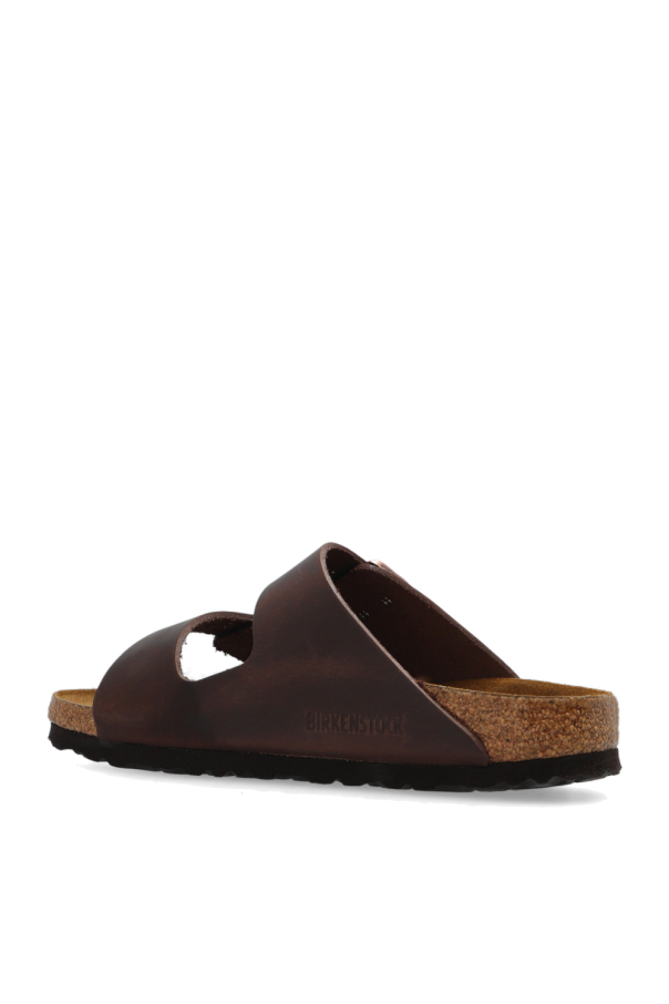 Brown ‘Arizona BS’ slides from Birkenstock. Crafted from oiled nubuck leather, this model features two adjustable buckle straps, an embossed logo on the side, an anatomically shaped cork-latex footbed and a brown natural cork sole with an EVA foam trim. Narrow width.