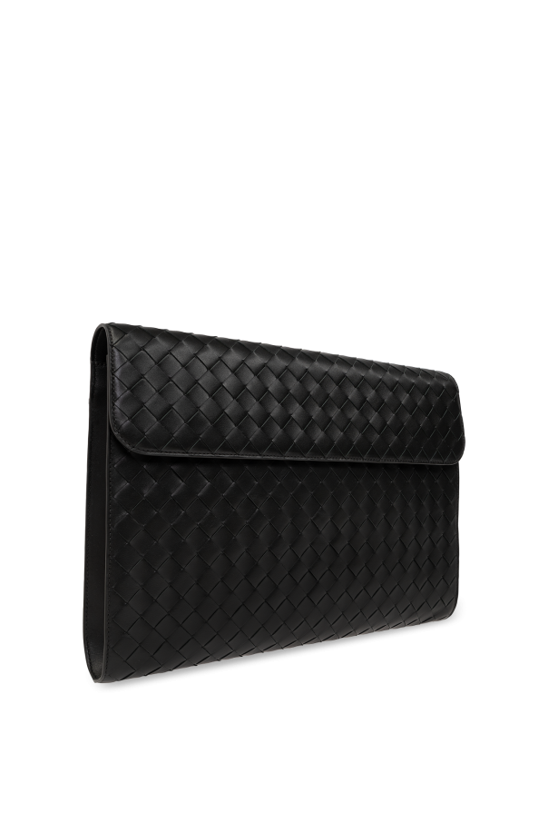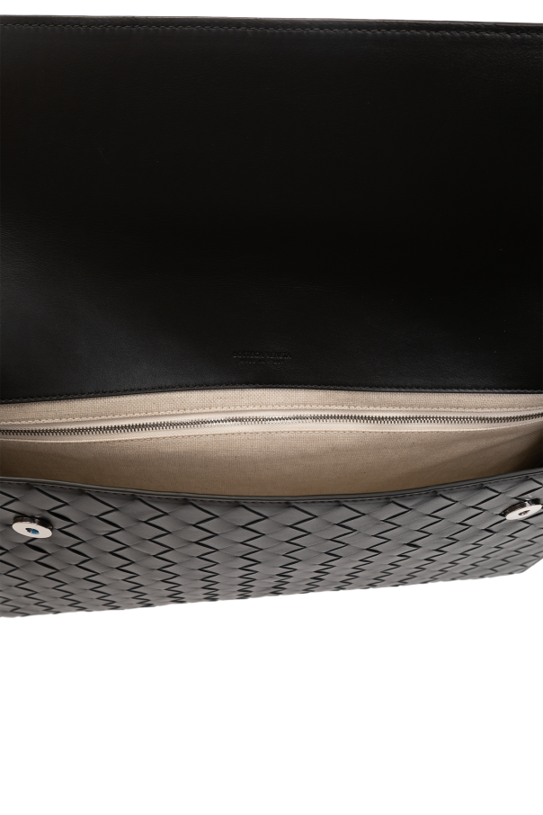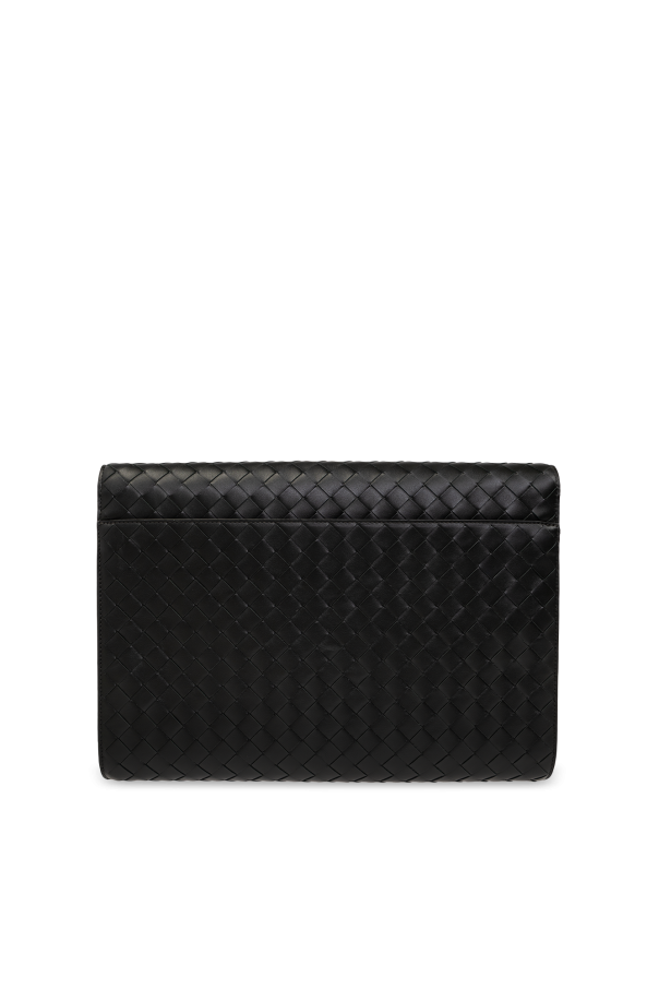 Dark green briefcase from Bottega Veneta. Made of calf leather with the brand’s signature Intrecciato weave, this design features a back pocket, silver-tone metal hardware and one internal compartment with one zip pocket.