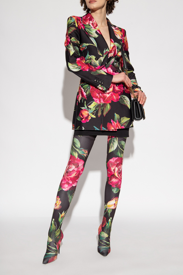 Black ‘Lollo’ heeled boots from Dolce & Gabbana. Crafted in stretchy fabric, this model features a pointed toe silhouette, a colourful floral print, a black leather sole and a silver-tone logo plaque on the heel.