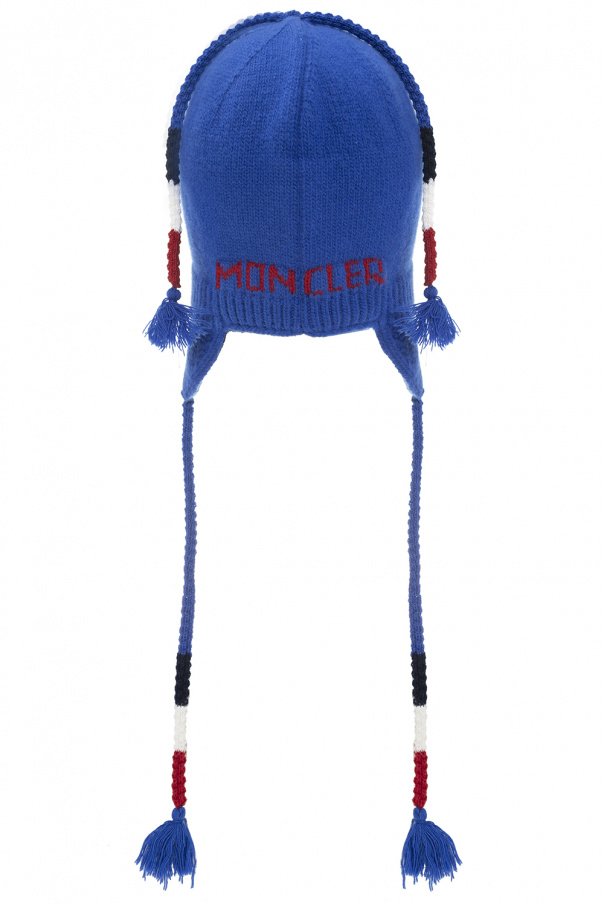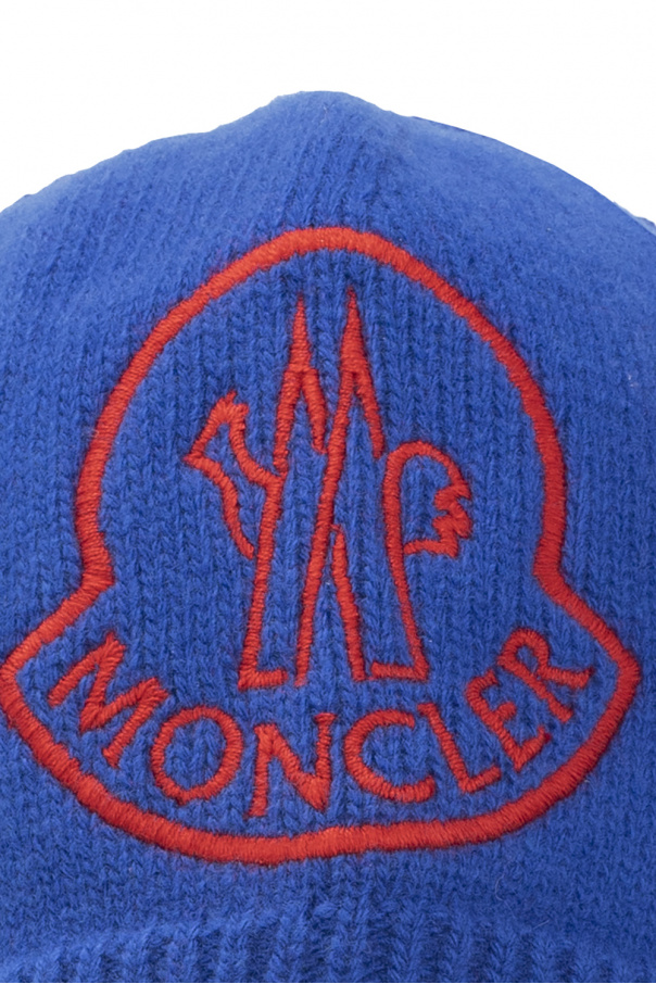 Dark blue beanie from Moncler. Crafted from wool, this item features fringe detailing and an embroidered logo in red.