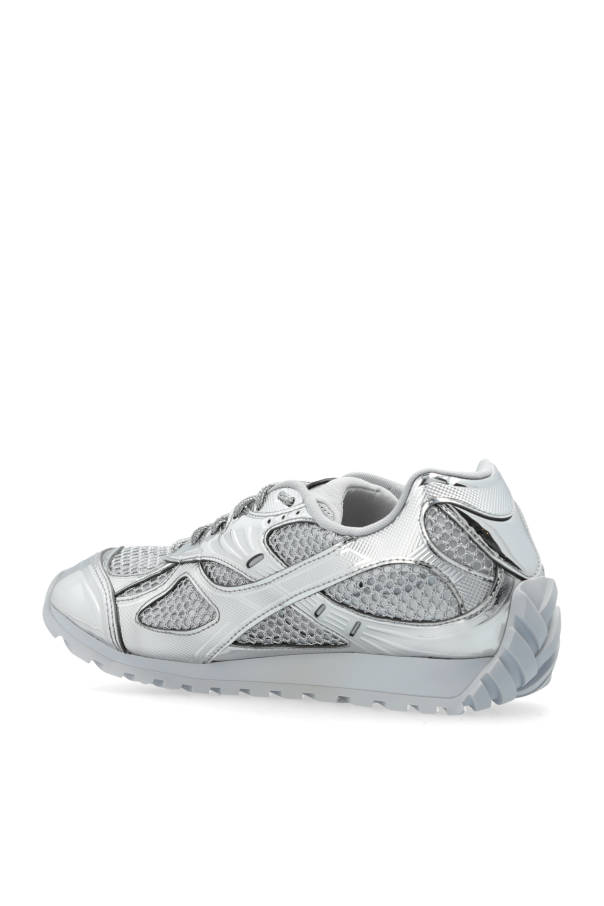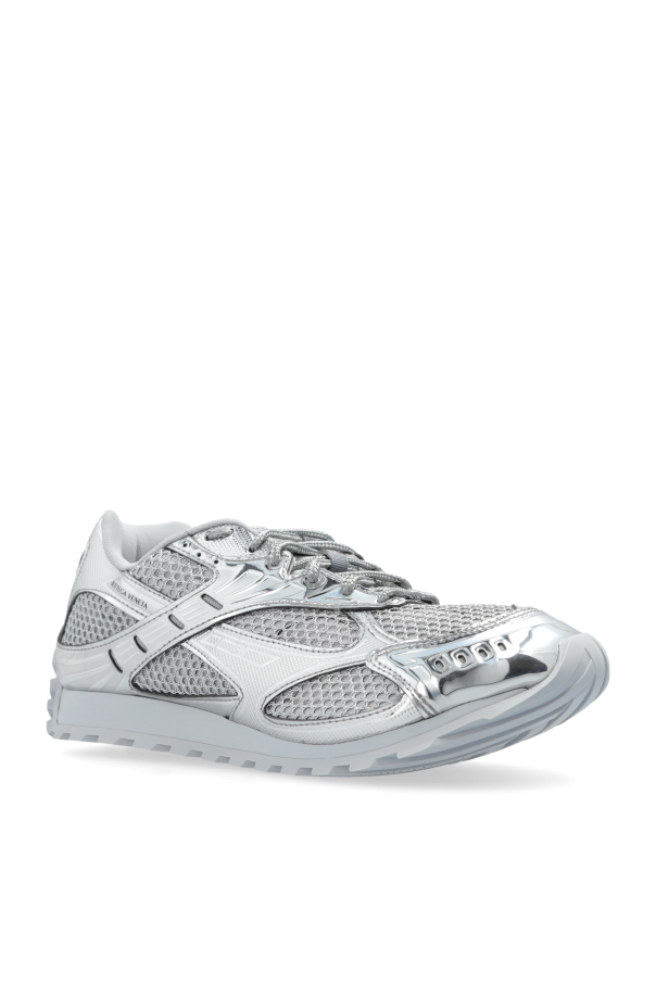 Introducing the exclusive women\'s sneakers, Orbit, by the illustrious designer Bottega Veneta. These low-top sneakers epitomize a harmonious blend of contemporary design and exceptional craftsmanship, making them a quintessential addition to any discerning wardrobe. Crafted with a sophisticated combination of mesh and leather, the Orbit sneakers boast a sleek, futuristic silver hue. The mesh components ensure breathability, while the leather accents add a touch of elegance and durability. The front of the sneakers features a striking metallic panel with perforations, enhancing their modern aesthetic. The designer\'s logo, prominently displayed on the tongue, further accentuates the exclusivity of these sneakers. The thick, robust sole provides excellent cushioning and comfort, with a tread pattern that guarantees superior traction. The classic lace-up design allows for a customizable fit, making these sneakers as practical as they are stylish. The silver-grey color palette ensures versatility, effortlessly complementing both casual and more refined outfits. Why Choose This Product? Exquisite Design: A perfect blend of sporty style and luxury finish. Premium Materials: Made from high-quality mesh and leather for breathability and durability. Designer Label: Featuring the prestigious Bottega Veneta logo. Comfort and Performance: Thick sole with excellent cushioning and grip. Versatile Styling: Silver-grey color easy to pair with various outfits.