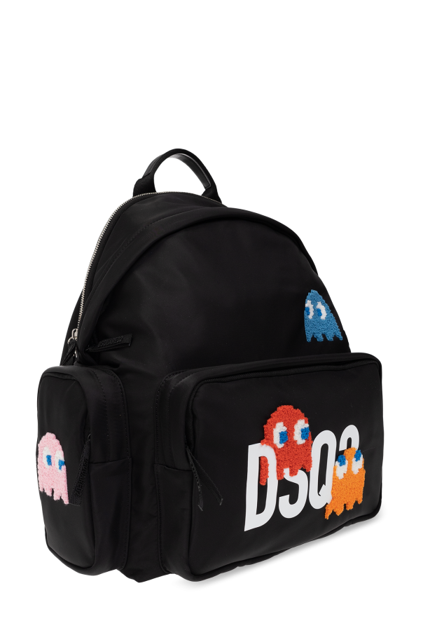 Black backpack from Dsquared2 x PAC-MAN™. Embellished with a graphic print and colourful patches, this design fastens with a zipper and features a half-round handle, adjustable shoulder straps, one zip pocket on the front, black metal hardware and one internal compartment with one zip pocket.