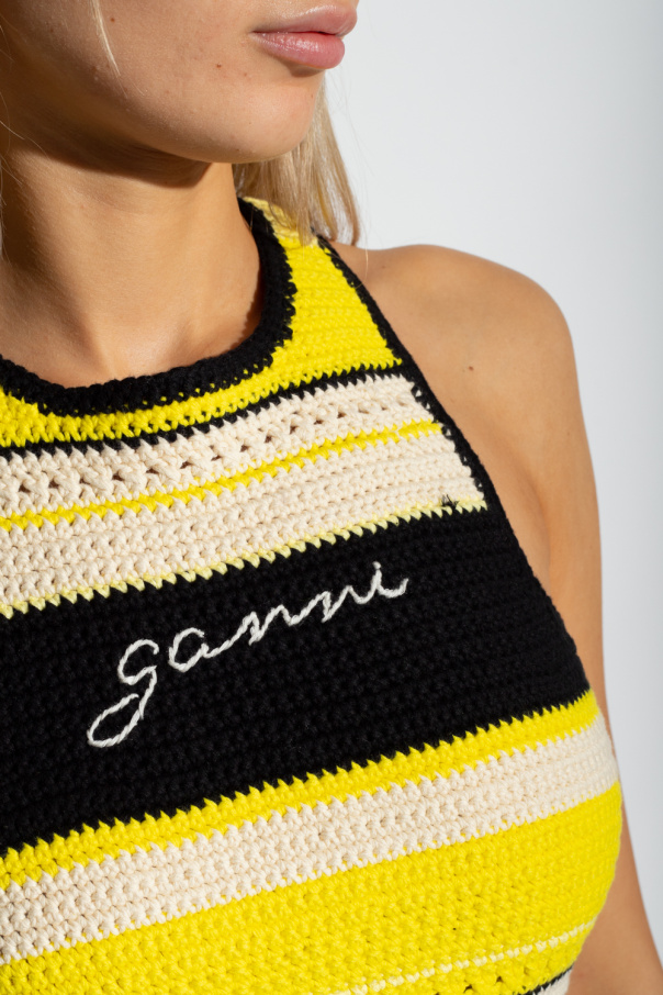 Cream, yellow and black top with a back zip and logo pattern from Ganni.