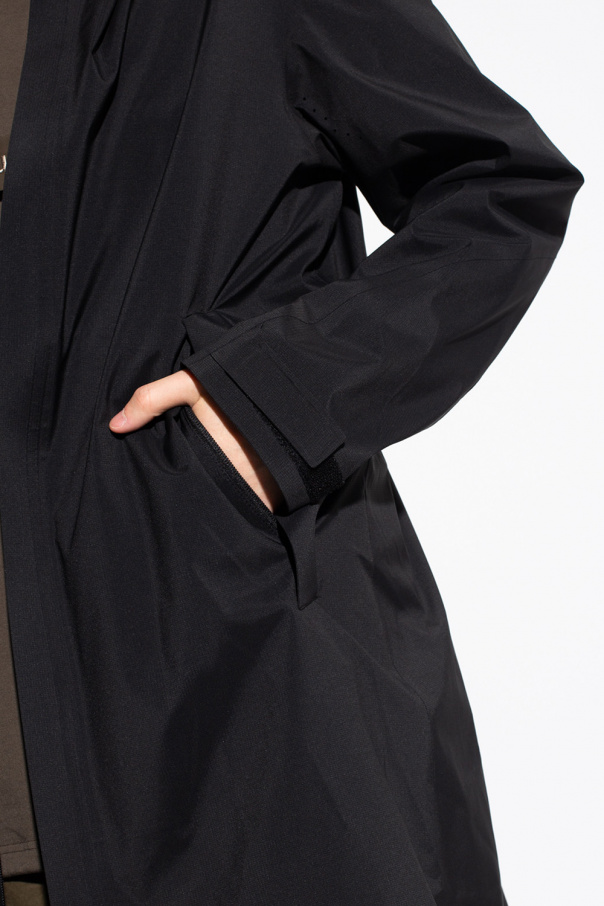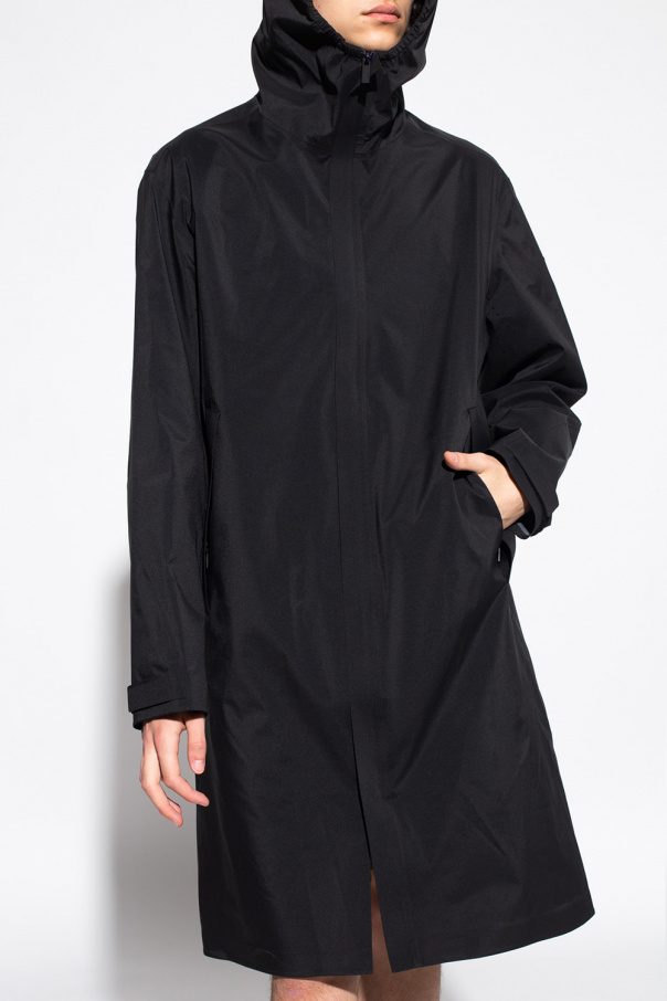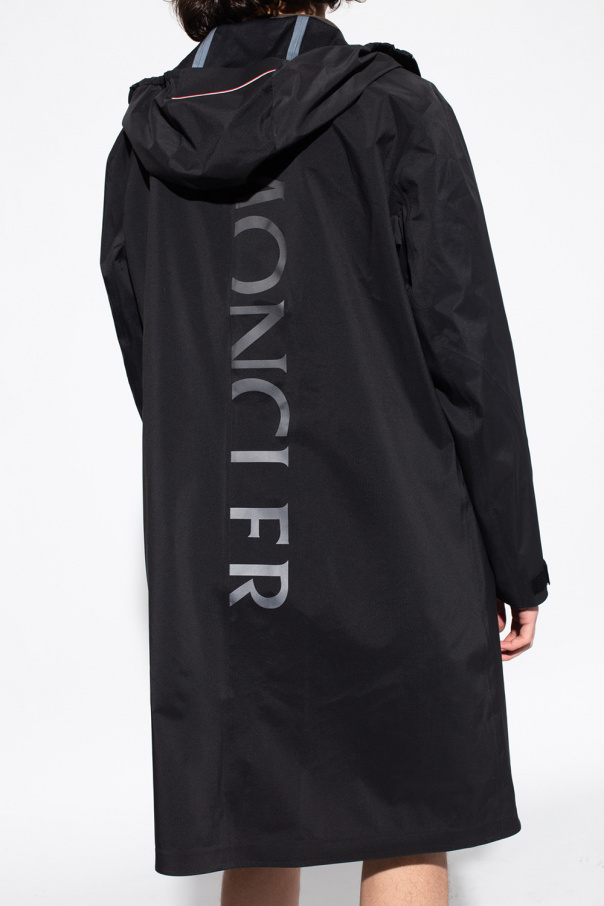 Black ‘Gavras’ hooded coat from Moncler. Fastened with a zip, this garment features a rubber logo appliqué on one sleeve and two zip pockets.