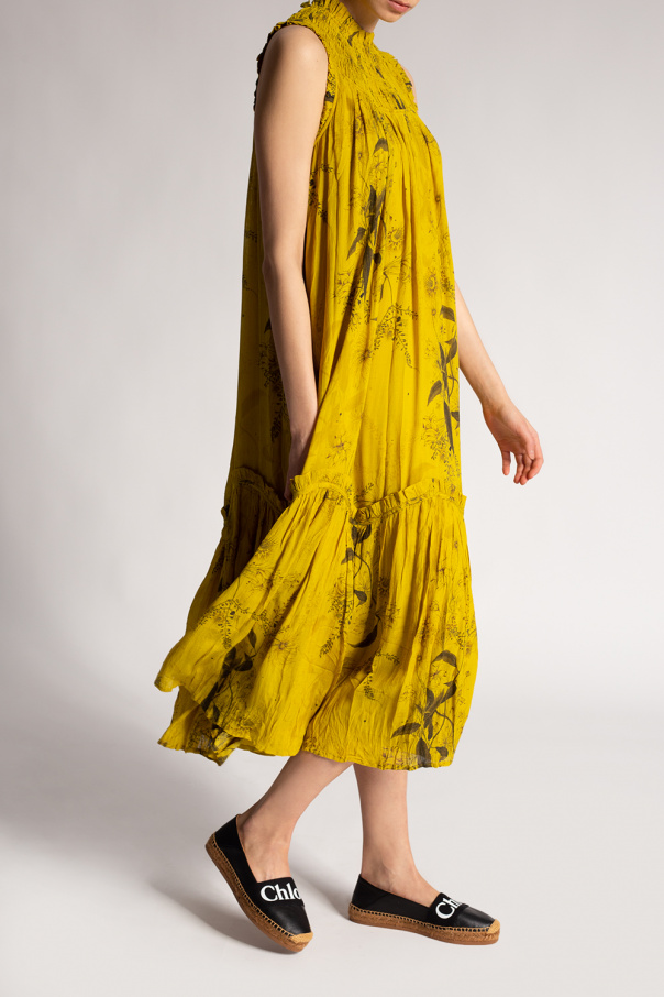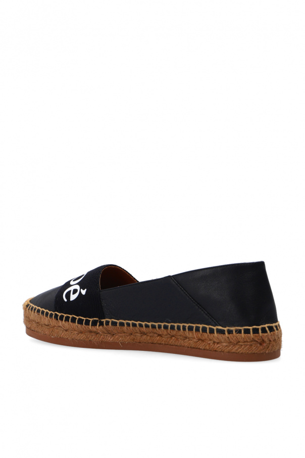 Black ‘Woody’ espadrilles from Chloé. Made from textile fabric and leather, this pair sits on a brown rubber sole and showcases a printed logo pattern in white.