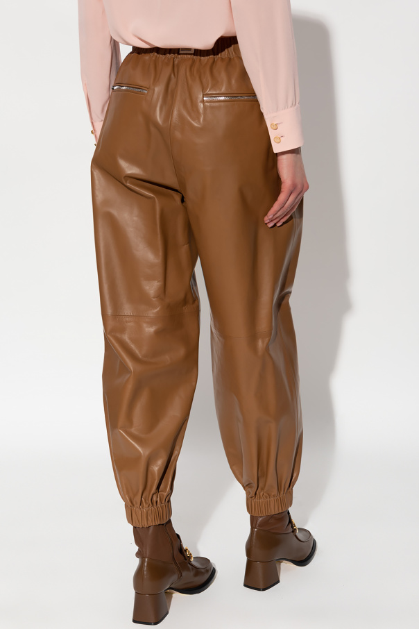 Brown trousers from Gucci. Crafted from lamb leather, this pair features a drawstring waistband, two front slip pockets and two back zip pockets.