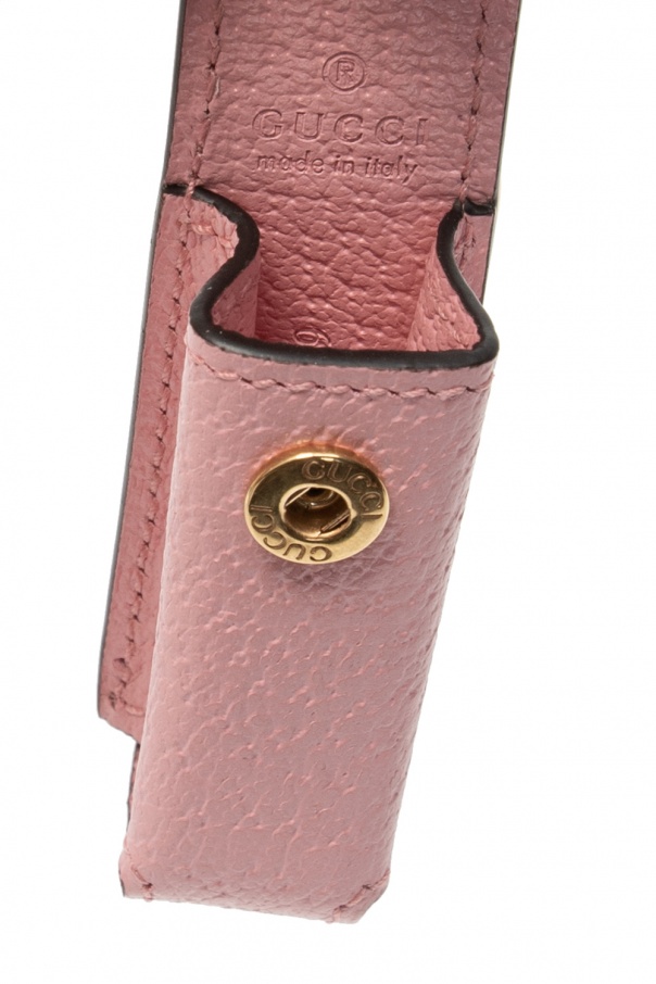 Pink lipstick case from Gucci. Made of leather, this item is complete with a snap fastening, a logo appliqué and a snap hook.