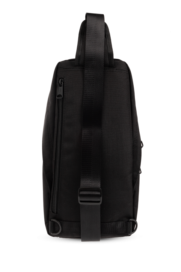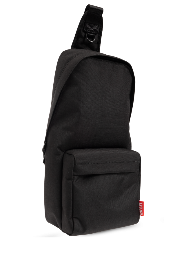 Black ‘D-BSC’ shoulder backpack from Diesel. Emblazoned with a red and white logo patch, this design features a two-way zip fastening, adjustable shoulder straps, black metal hardware, one zip pocket on the front and one internal compartment.