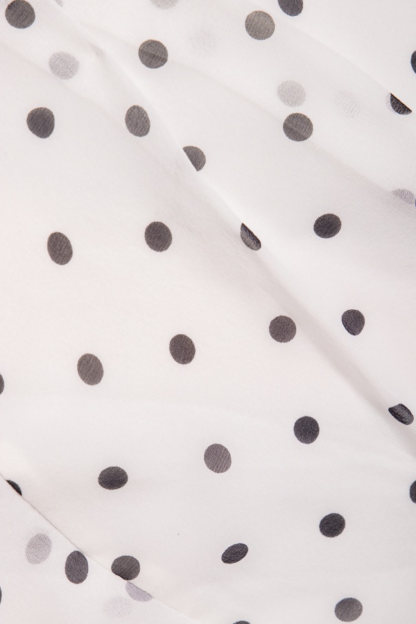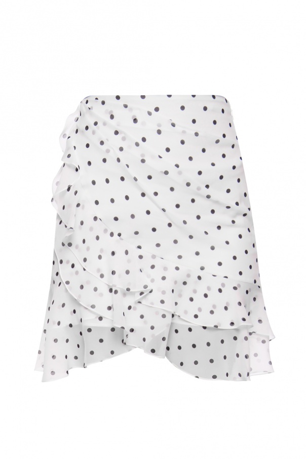 White skirt from Balmain. Made of silk. Zip fastening on the side. Decorated with a black polka dot pattern and ruffles.