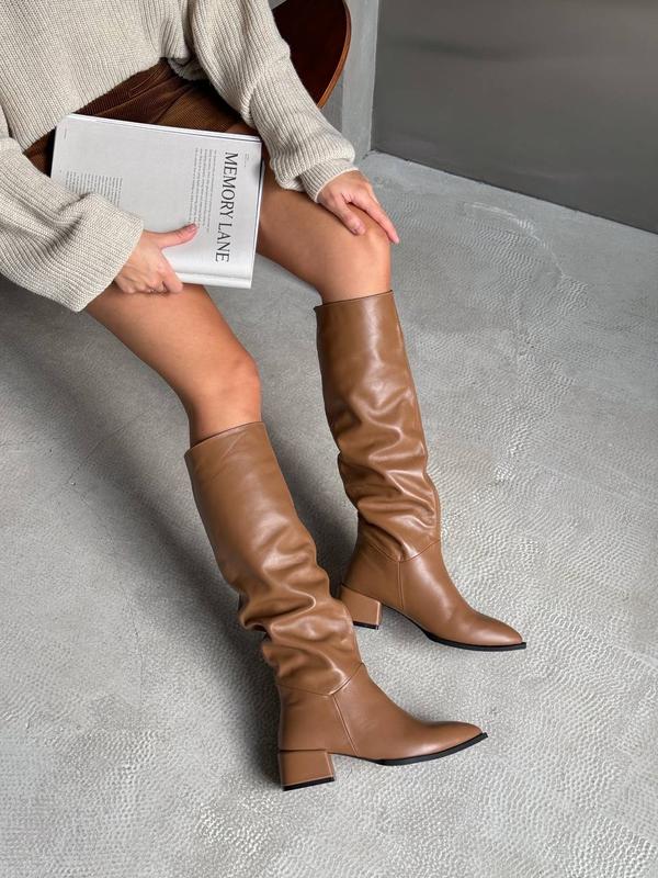 Зроблено в Україні?:Виробництво ,Матеріал верху:Шкіра ,Висота каблука:Низький ,Висота виробу:Високі ,Халява:Стандартна ,Сезон:Зима , Демісезон ,Матеріал підкладки:Байка , Хутро , Вовна ,Принт:Без принту ,Тип підошви:Каблук ,Мембрана:Немає ,Довжина устілки:25 см , 24,5 см , 23,5 см , 24 см , 26 см ,Опис