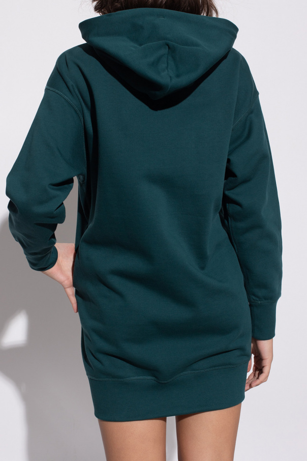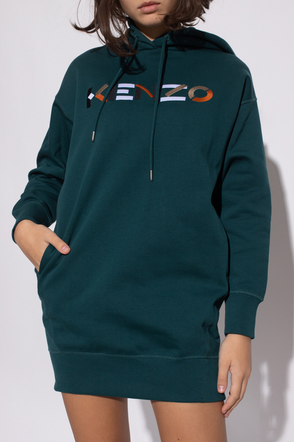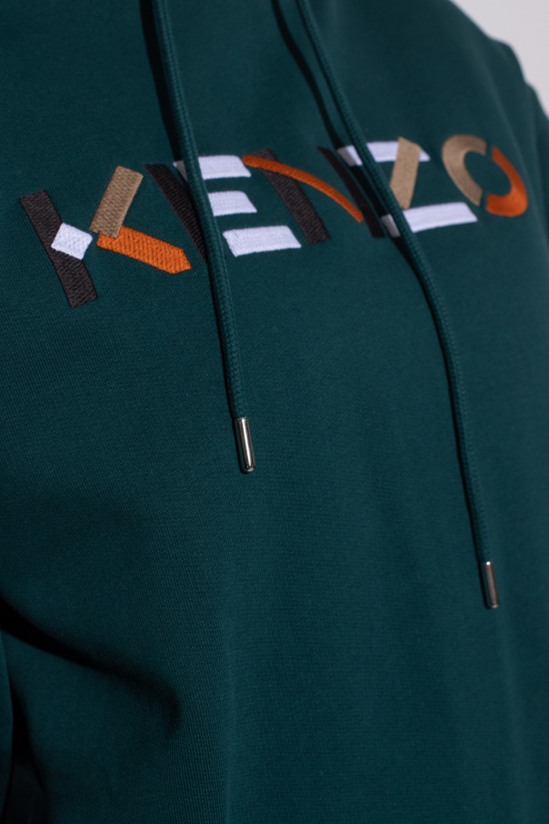 Green sweatshirt with a drawcord-adjustable hood from Kenzo. Crafted from cotton with an elongated silhouette, this hoodie showcases white, brown and red graphic logo embroidery on the front, a kangaroo pocket and ribbed trims on the bottom hem and cuffs.