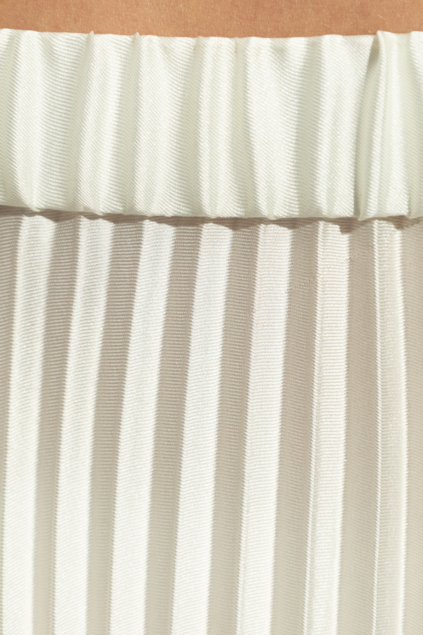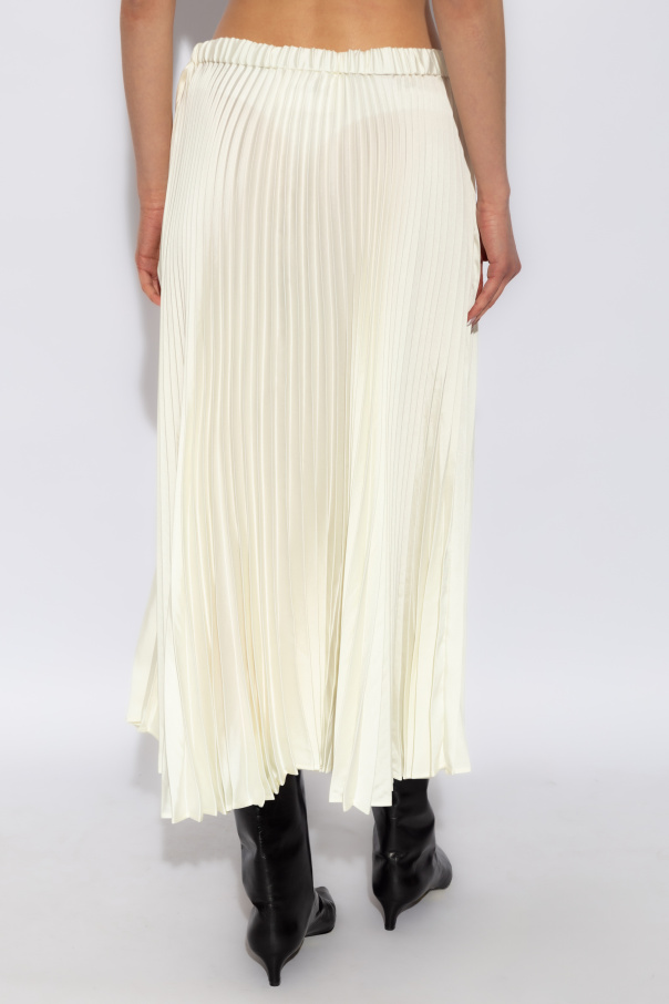 Introducing the quintessence of contemporary elegance and fluidity – the Pleated Skirt by the illustrious Jil Sander. Crafted from a blend that mirrors the ethereal qualities of silk and chiffon, this cream-hued masterpiece redefines sophistication. Its long, flowing silhouette, adorned with meticulously spaced pleats, delivers a graceful dynamism and an added volume that pirouettes with every step you take. The fabric\'s lightweight and airy nature assures comfort while its enduring pleated design testifies to an exceptional level of craftsmanship, employing a permanent pleating technique that ensures the skirt maintains its pristine condition and aesthetic appeal over time. An elastic waistband secures a snug fit, accommodating various body shapes with ease and eliminating the need for visible fastenings, which aligns with the skirt\'s minimalist and refined design ethos. Devoid of external labels or logos, this skirt stands as a testament to the subtle and minimalist approach characteristic of Jil Sander\'s exclusive collections. It seamlessly marries classic aesthetics with modern details, making it a transcendent piece for those who value understated luxury. Why Purchase This Product? Impeccable craftsmanship and quality, featuring durable pleating that retains its form. Versatile elegance suitable for various occasions, from day-to-day elegance to evening sophistication. Comfort and fit are ensured with an elastic waistband, making it a staple for any silhouette. A testament to minimalist luxury, aligning with Jil Sander\'s renowned design philosophy.