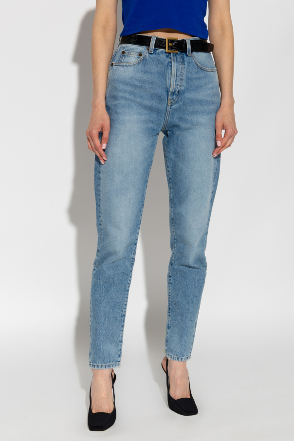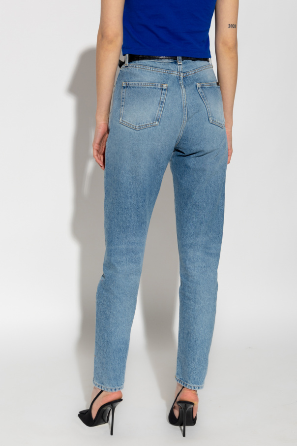 Blue high-waisted distressed slim jeans from Saint Laurent. Fastened with buttons, this pair features a vintage effect, leather logo-embossed patch at the back, five slip pockets and tapered legs.