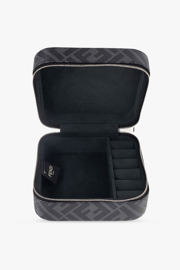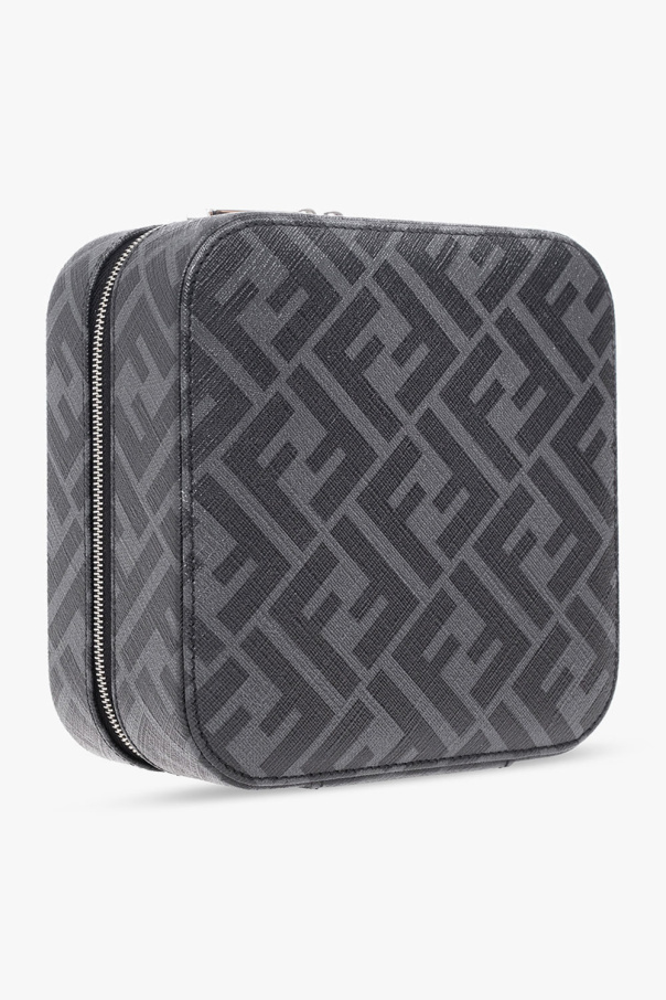 Black and grey jewellery case from Fendi. Made of faux leather, this model features a two-way zip, the FF motif, one internal compartment and silver-tone metal hardware.