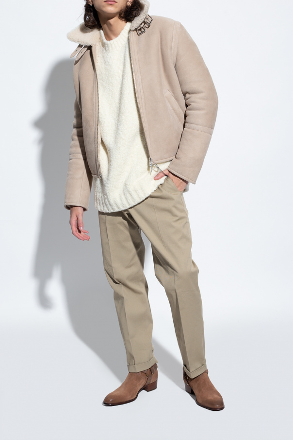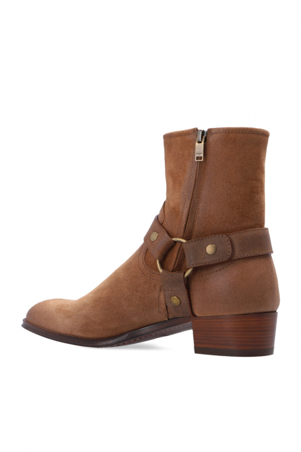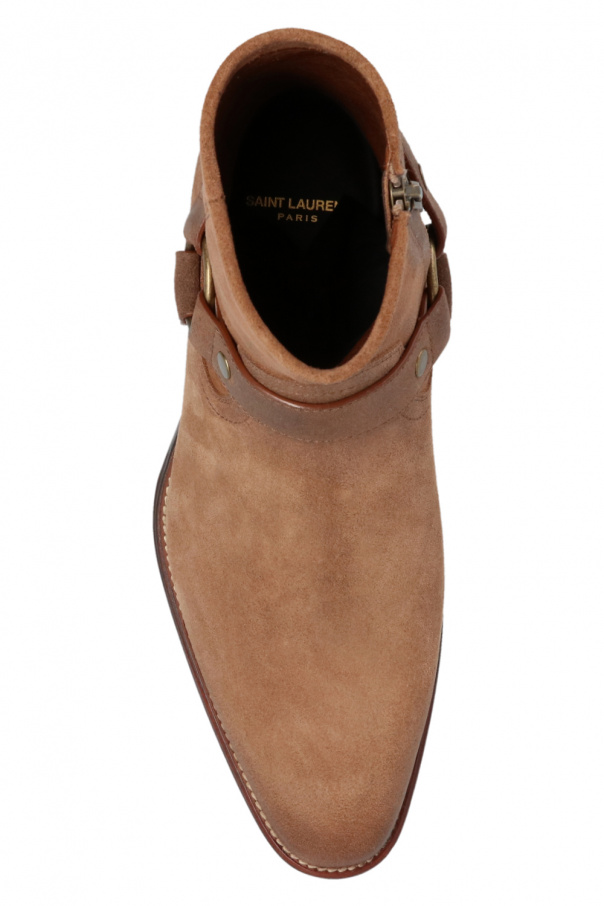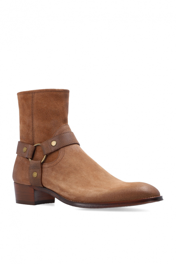 Brown ‘Wyatt’ ankle boots from Saint Laurent. Made of suede, this model sits on a brown leather sole and features a side zipper accompanied by a decorative ring.