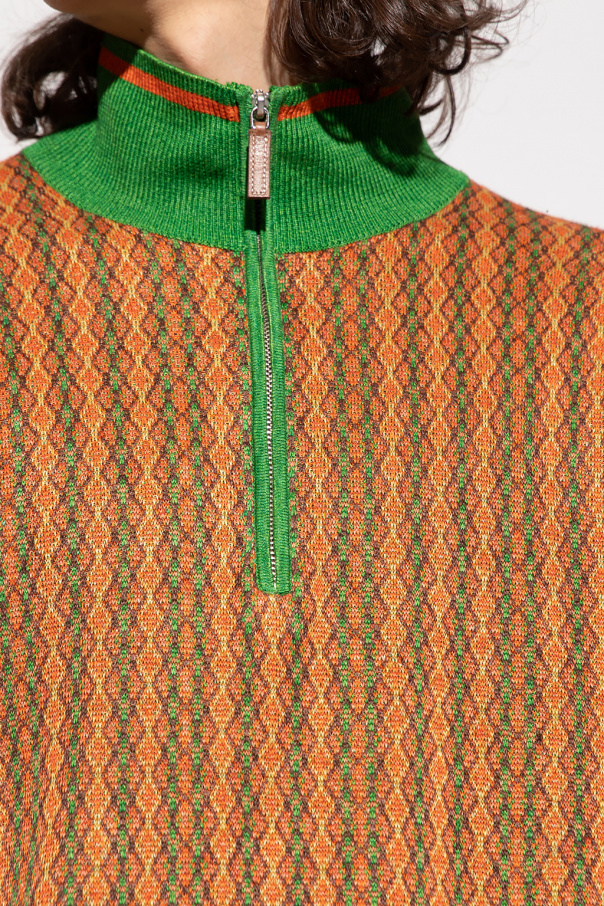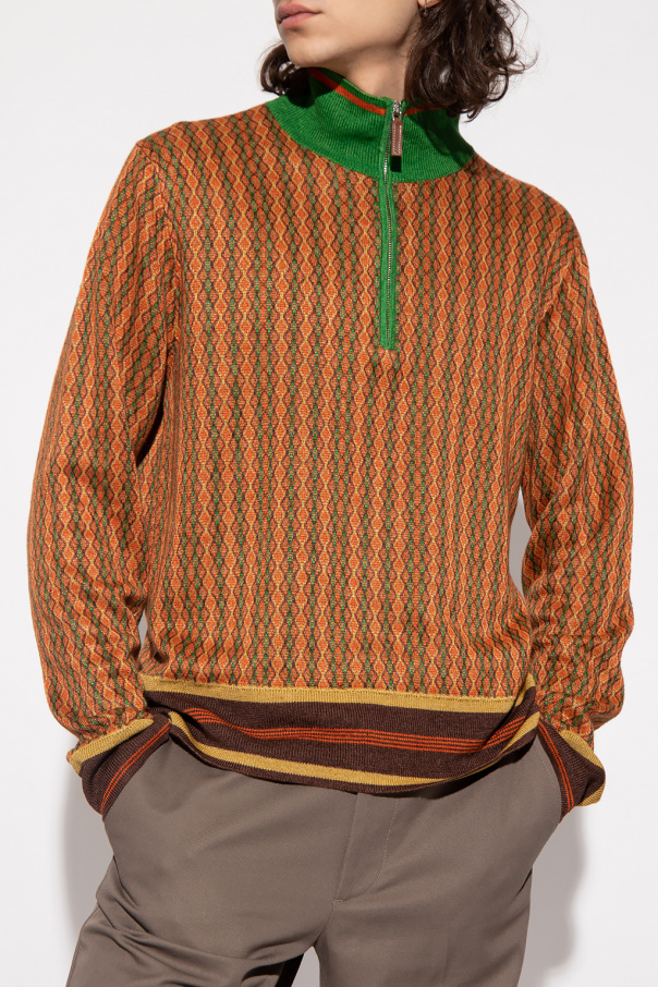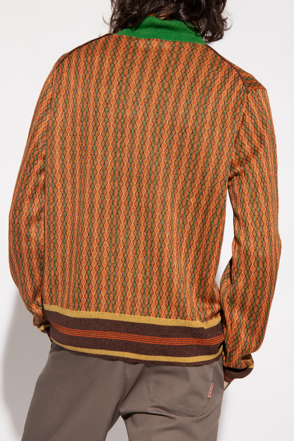 Orange, blue and brown ‘Orchestre’ sweater from Wales Bonner. Crafted from linen, this garment features a high neck, pattern and ribbed trims at the neck, hem and cuffs.