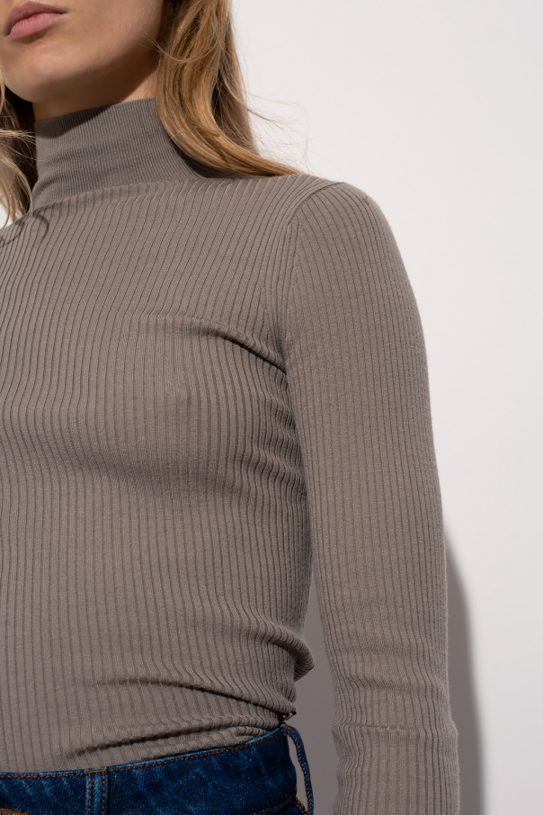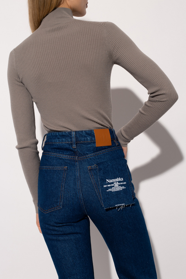 Grey and beige top with a standing collar from Nanushka. Made of wool from sustainable farms, this style features ribbed detailing, a brown logo appliqué on the front and elasticized trims on the edges.
