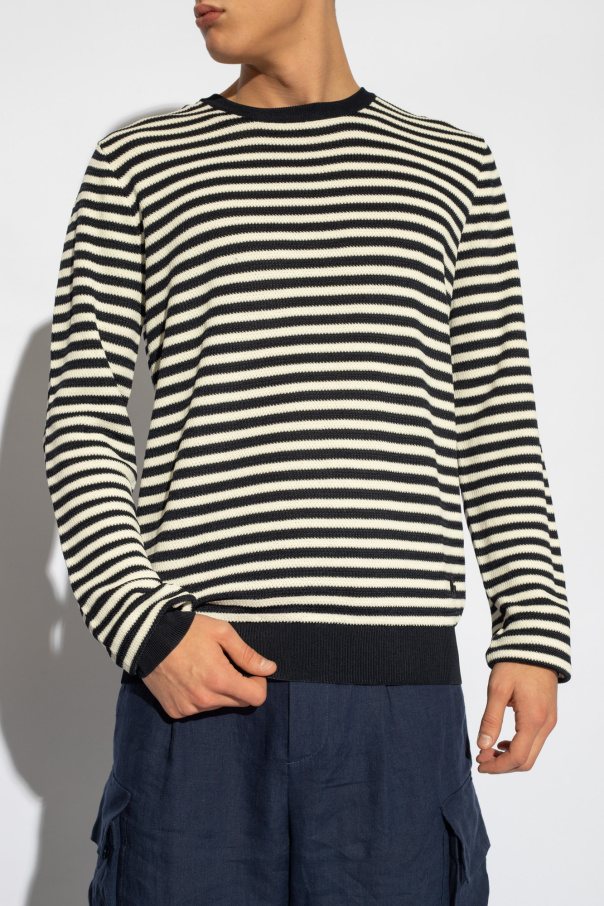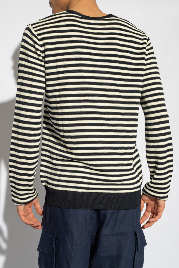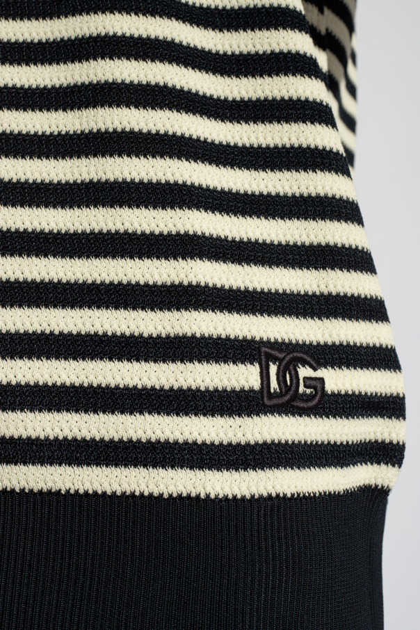 Navy and white sweater with long sleeves from Dolce & Gabbana. This garment is enriched by a stripe pattern, logo embroidery and ribbed trims at the crew neck, hem and cuffs.