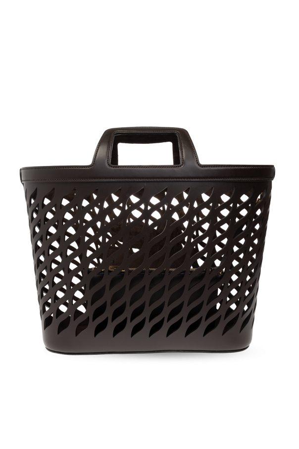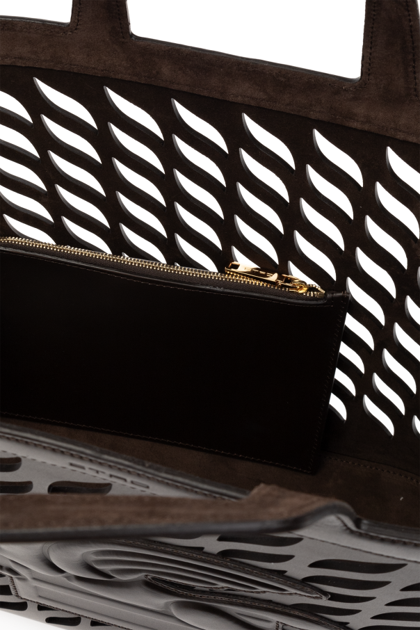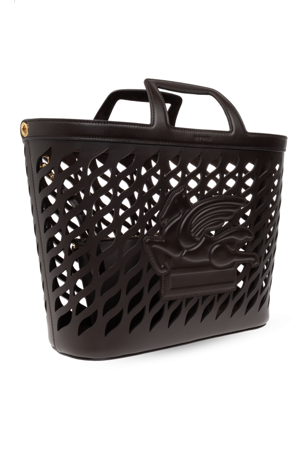 Dark brown shopper bag from Etro. Crafted from leather with openwork detailing, this design showcases an embossed logo and the brand\'s signature Pegaso motif. It is complete with two handles, gold-tone metal hardware and one internal compartment with a removable zip pouch on a strap.