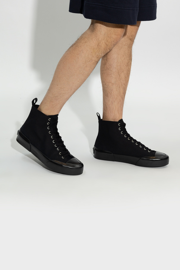 Black sneakers from JIL SANDER. Made of cotton with a high-top silhouette, this lace-up model sits on a black rubber sole and showcases an embossed logo at the back.