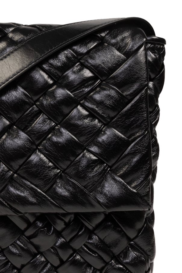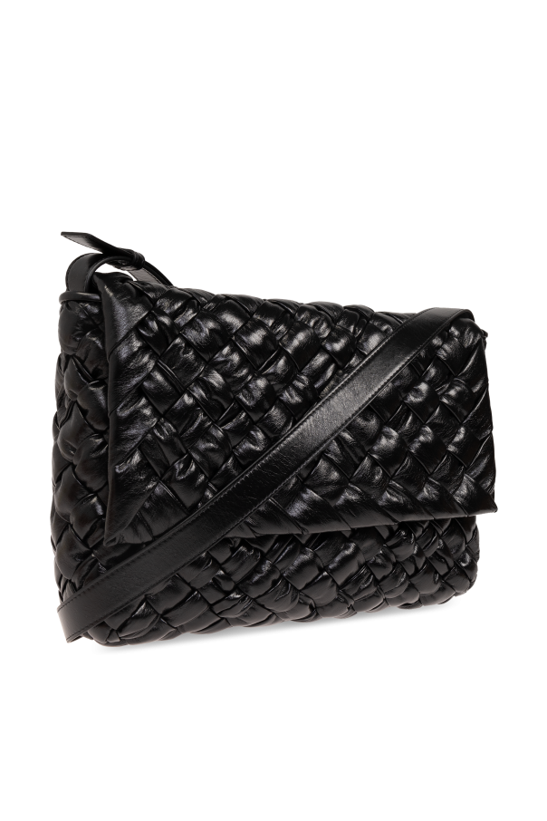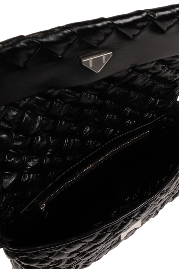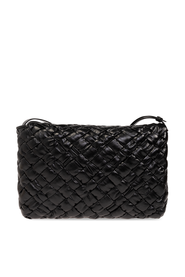 Introducing the \'Rumple\' Shoulder Bag by Bottega Veneta, a masterpiece of design and craftsmanship. This exquisite piece is meticulously constructed from 100% calf leather, boasting a matte finish that exudes sophistication and timeless elegance. The bag\'s dominant black hue ensures versatility and universal appeal, making it an essential accessory for any wardrobe. The \'Rumple\' Shoulder Bag features Bottega Veneta\'s signature Intreccio weave, creating a three-dimensional texture that adds depth and complexity to its appearance. This intricate pattern, coupled with the bag\'s sleek profile, sets it apart in the realm of luxury accessories. A wide, flat strap offers comfortable wear across the body or on the shoulder, enhancing its practicality without compromising style. Attention to detail is evident in every aspect of the bag\'s design, from the discreet triangular metal logo that hints at its prestigious origins, to the slanted straps on the front that serve both aesthetic and functional purposes. The bag secures with a magnetic snap closure, while a zippered internal pocket provides safe storage for valuables. Silver-tone metal finishes perfectly complement the bag\'s refined aesthetic. Why Purchase This Product? Constructed from premium calf leather for durability and elegance. Features Bottega Veneta\'s iconic Intreccio weave, offering a unique and sophisticated texture. Versatile black color and elegant design suitable for any occasion. Functional elements like a magnetic snap closure and internal zippered pocket enhance security. Adjustable shoulder strap for customized comfort and wearability.
