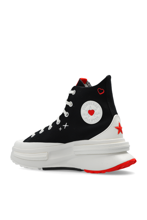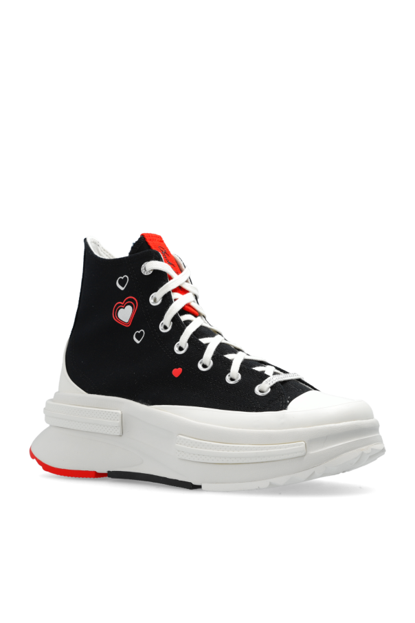 Black ‘Run Star Legacy CX Platform Y2K Heart’ high-top sneakers from Converse. Crafted from canvas, this lace-up pair features a heart print, logo patch on the side, shoelaces with a metal crystal-embellished detail and a rubber sole in white, black and red.
