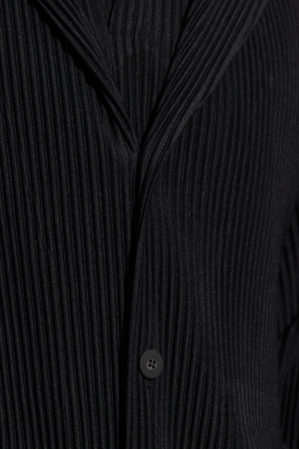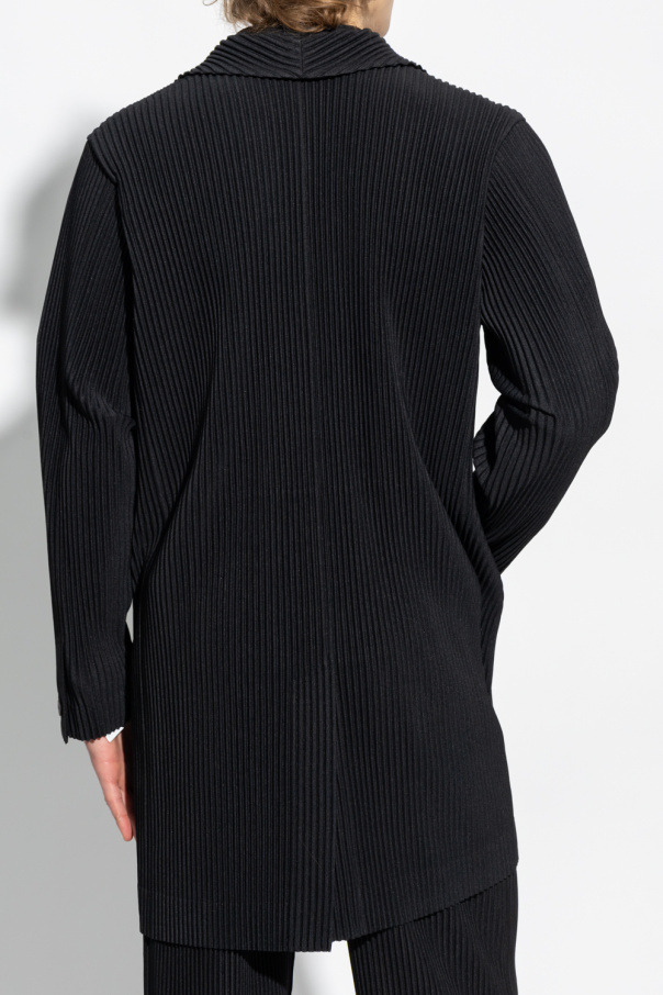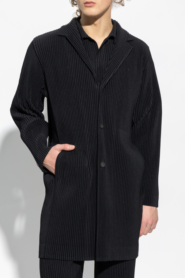 Black coat from Issey Miyake Homme Plisse. Crafted from recycled material, this style fastens with buttons and features notch lapels, two slip pockets, a single back vent and long sleeves with button cuffs.