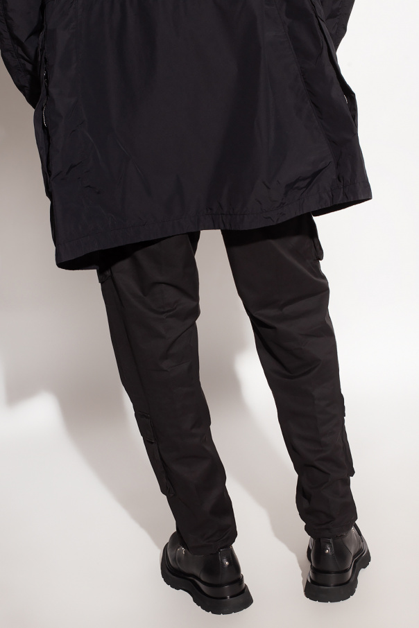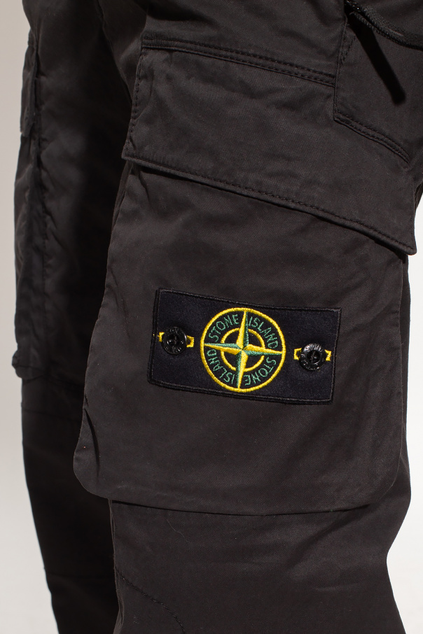 Black trousers from Stone Island. Made of cotton, this pair features a zip fly with a button, three zip pockets, two flapped pockets, drawstring hems and a black, yellow and green logo patch for brand recognition.