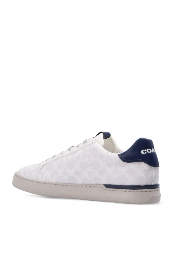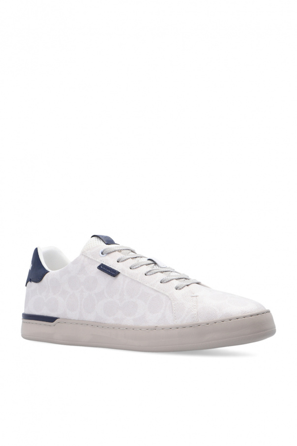 White and light grey sneakers from Coach. Decorated with a monogram pattern, this lace-up pair features a navy heel tab with a raised logo in white and a rubber sole in grey and navy.
