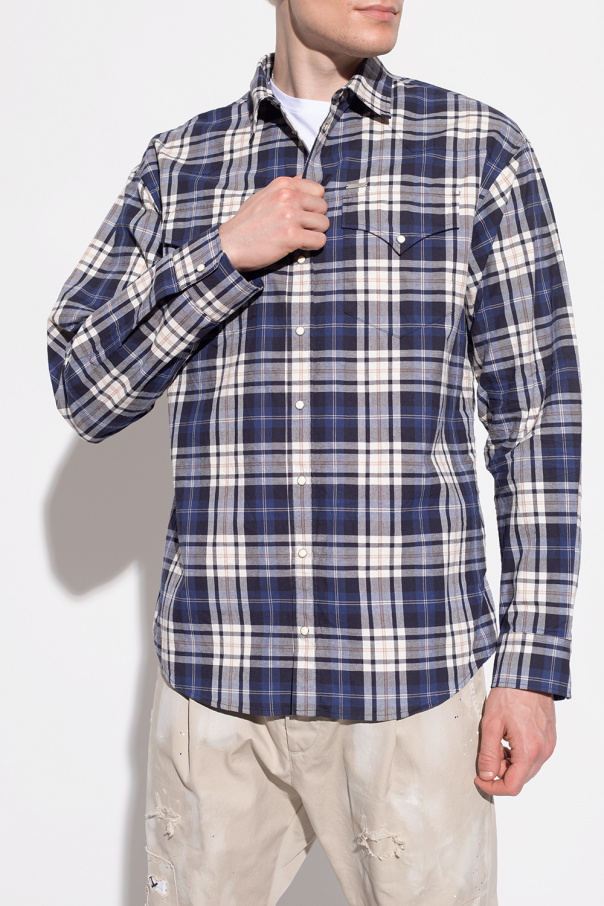 Navy, white and beige shirt from Dsquared2. Made of cotton, this garment features snap fastenings, two flap pockets, metal logo appliqué in silver-tone and long sleeves with snap-fastened cuffs.
