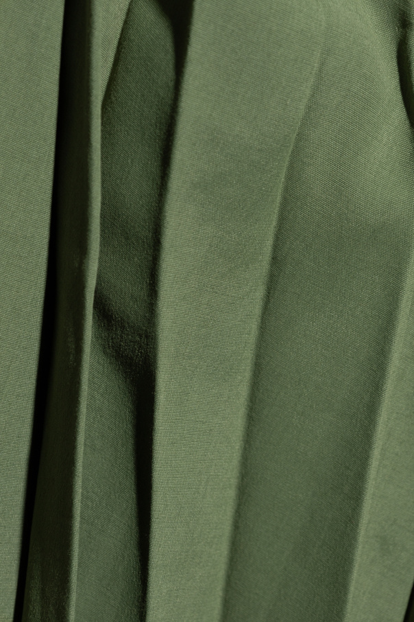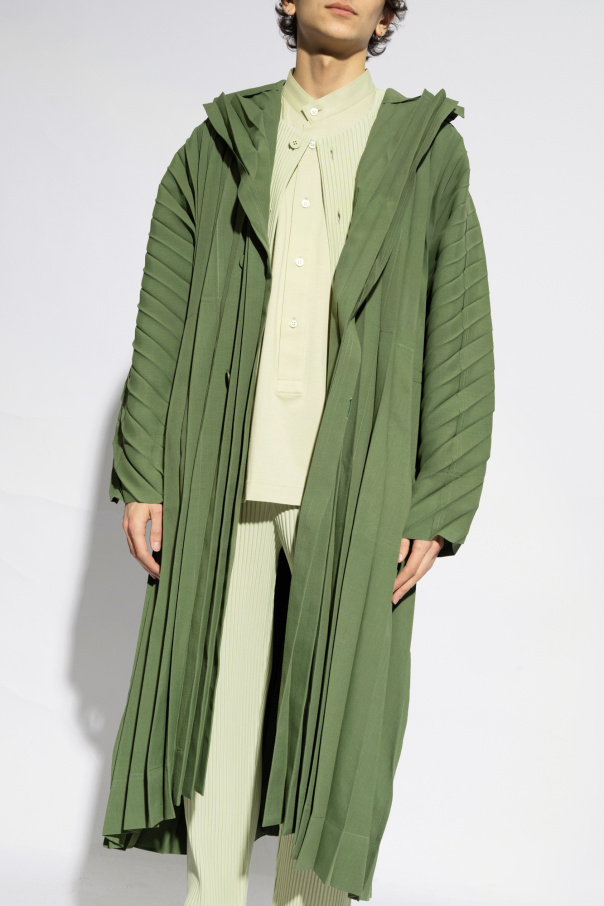 Dark green coat from Issey Miyake Homme Plisse. Crafted using the pleating technique, this style features a relaxed fit, button fastenings, notch lapels, two frontal pockets, long sleeves and a waist-cinching tie belt.