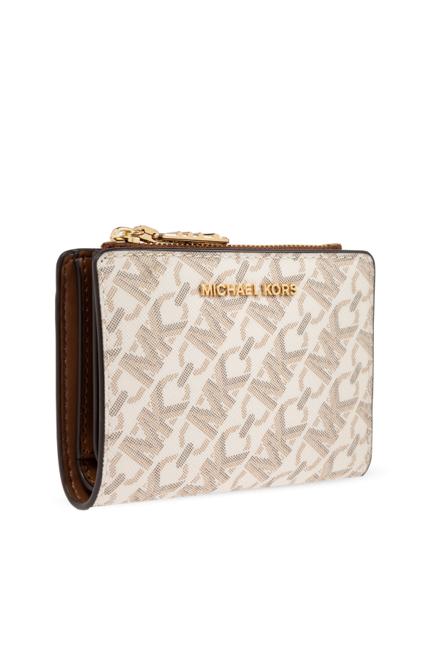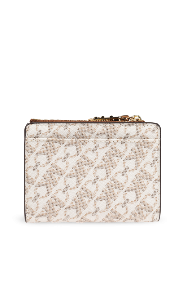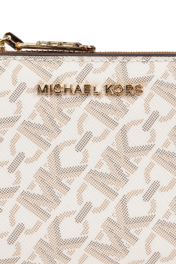 Introducing the `Empire` Zip Wallet by Michael Michael Kors, a testament to refined luxury and sophisticated design. Crafted from 100% canvas, this wallet stands out with its creamy hue and the iconic, intricately woven pattern of the designer\'s logo across the front. This detail not only accentuates its elegance but also imbues it with a distinct, recognizable aesthetic. The interior, revealed upon unzipping, showcases a smooth, brown lining complemented by gold accents, including a small logo emblem and the zipper itself, adding a touch of understated opulence. Designed for the modern connoisseur, it features a dedicated bill compartment, a secure zippered coin pocket, and six card slots, ensuring functionality is as paramount as form. Why purchase the `Empire` Wallet? Elegant design with the distinctive Michael Michael Kors logo pattern. Luxurious canvas material and gold accents. Practical interior layout with ample space for essentials. Exceptional craftsmanship and attention to detail.