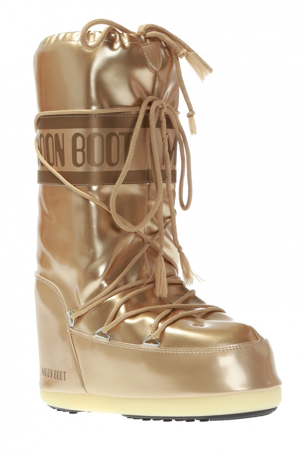 Gold-tone ‘Classic Vinil’ lace-up snow boots from Moon Boot featuring printed grey pattern with logo and beige and black rubber sole at the base.