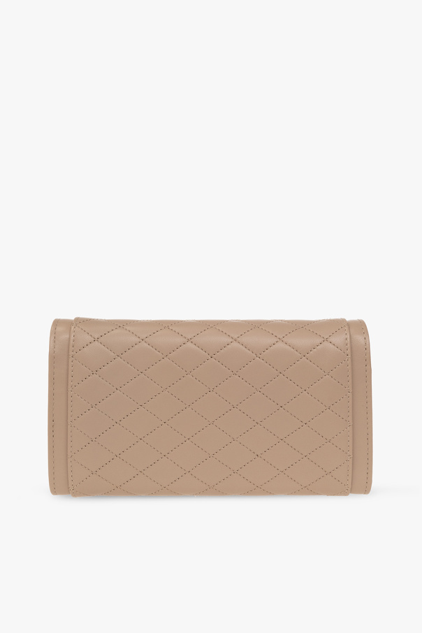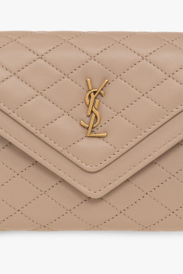 Light brown quilted wallet from Saint Laurent. Made of leather, this design features a snap fastening, a logo application, antiqued gold-tone metal hardware and two compartments, twelve card slots, a bill section and a coin gusset inside.