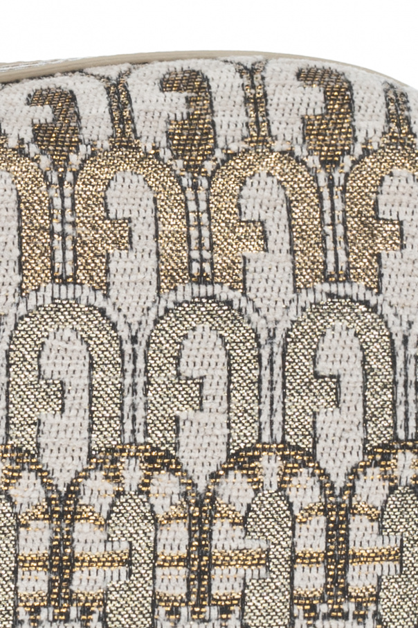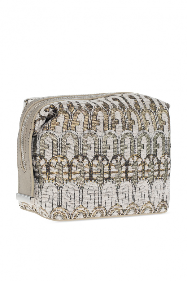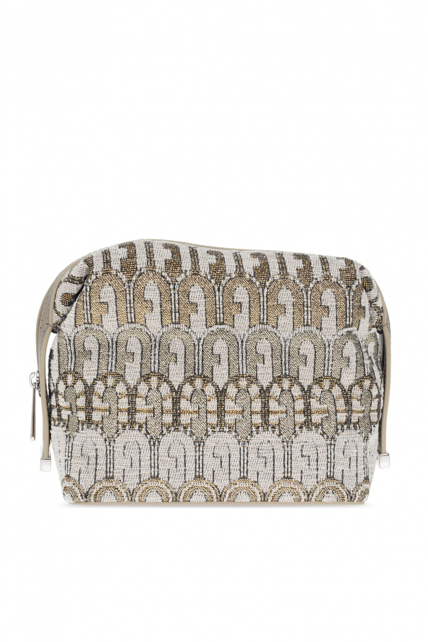 Cream and gold-tone ‘Opportunity’ wash bag from Furla. Embellished with a jacquard ‘Ethnic Arch’ pattern with a logo, this design features a zip fastening, glittery thread trimming and one internal compartment with a slip pocket.